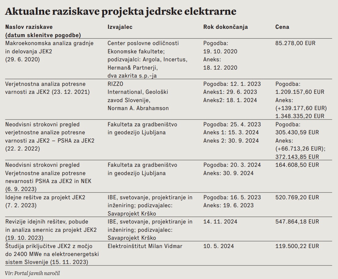 Za katere raziskave gre? Gen energija je še pod bivšo, Janševo vlado decembra 2021 naročila raziskavo »Verjetnostna analiza potresne varnosti za JEK 2«. Ocenjena je bila na 1,21 milijona evrov, morala pa bi biti dokončana januarja 2023, a sta bila k pogodbi pripisana aneksa, ki sta izvedbo podražila za dobrih 139.000 evrov in rok dokončanja zamaknila za leto dni, na 18. januar letos. Študijo, ki jo je izvedel konzorcij na čelu z ameriško inženirsko družbo Rizzo International s partnerjema Geološkim zavodom Slovenije in ameriškim strokovnjakom za potresni inženiring Normanom A. Abrahamsonom, imajo torej v Gen energiji že tri mesece. A javnost do nje nima dostopa, v odločbi so nam dostop do nje brez pojasnil zavrnili s stavkom: »Dokumenti so še v postopku izdelave.«