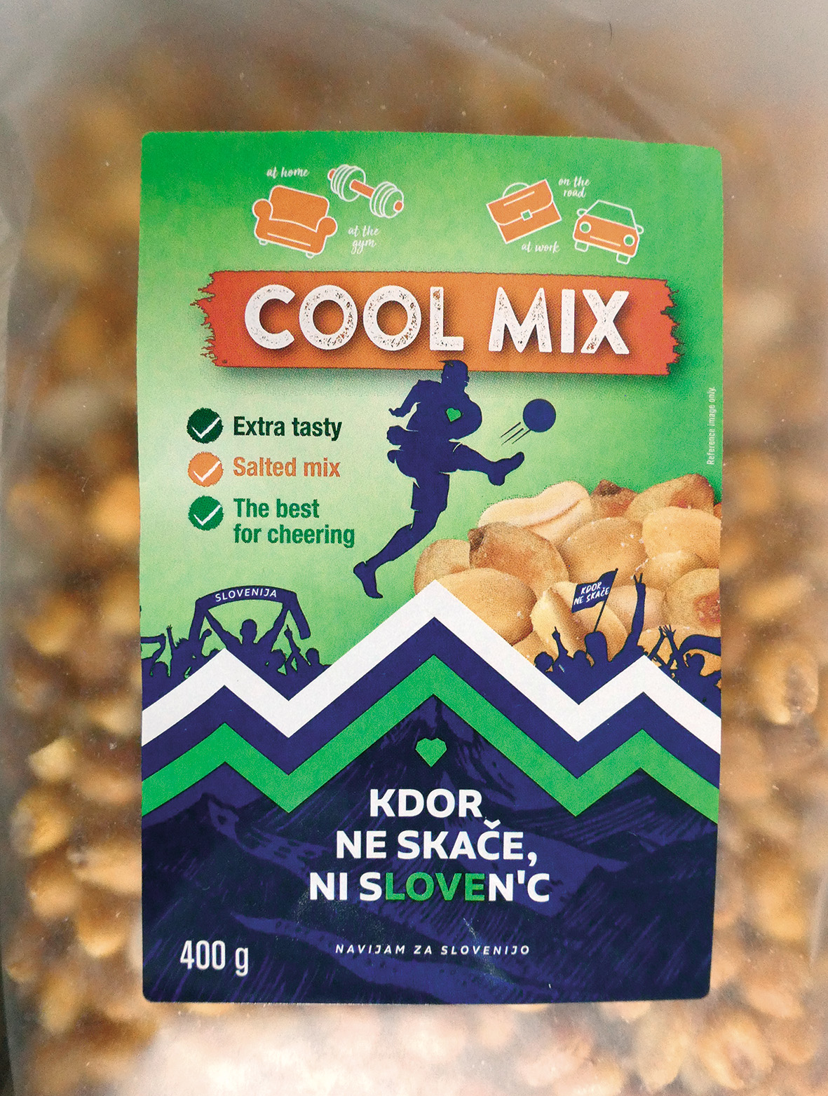 Nogometna navijaška strast je pri nas očitno dovolj močna, da prenese vse, če le vsebuje simbolni Triglav in dežurni nogometni navijaški slogan »Kdor ne skače, ni Sloven’c«, ki se, mimogrede, gladko požvižga na paraplegike. Hrustljavi slani prigrizek COOL MIX trka na patriotska čustva gorečih privržencev slovenskih nogometašev prav z dotičnima dvema elementoma ter dodanim napisom »Navijam za Slovenijo«, ki ne dopušča nobenega dvoma. Še dobro, ker je vse ostalo, od samega imena izdelka do njegovega opisa ter lokacij, kjer naj bi ga med navijanjem grizljali, v angleščini. Mešanica suho praženih slanih arašidov in pražene slane koruze je tako »extra tasty, salted mix, the best for cheering«, uživala pa naj bi se »at home, at the gym, on the road, at work«. Nogometaš z zelenim srcem na etiketi je očitno slovenski, ter tudi navijači, ki bodo nasedli temu verbalnemu in vizualnemu skrpucalu, vse ostalo je uvoženo; sestavine – poleg koruznih zrn in arašidov so to še sončnično olje, palmovo olje in sol – prihajajo iz Hrvaške, Španije in Brazilije. Za piko na i grickalice pakirajo na Hrvaškem, v firmi Marjan voće.