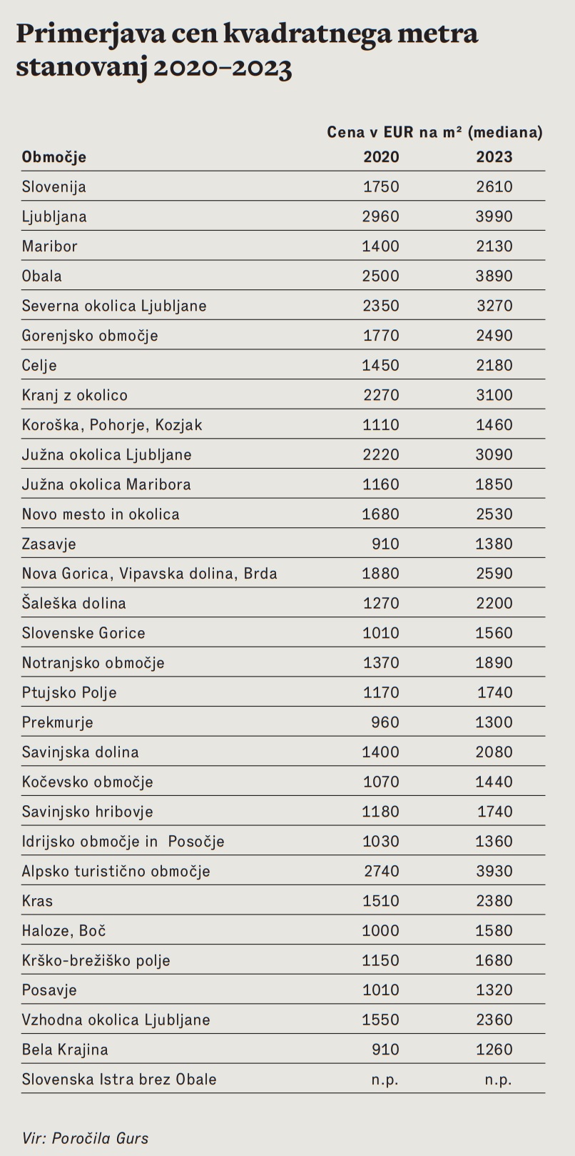 Medtem ko se je neto plača v vseh statističnih regijah v Sloveniji v zadnjih štirih letih, 2020–2023, nominalno zvišala za petino, torej za 20 odstotkov, so se cene stanovanj v tridesetih analitskih območjih, ki jih upošteva Geodetska uprava, zvišale precej bolj, od 30 do celo 70 odstotkov. Če ponazorimo drugače: za kvadratni meter povprečnega stanovanja v Ljubljani je bilo treba v letu 2020 odšteti manj kot 2,5 povprečne neto plače, konec leta 2023 pa so bile potrebne skoraj tri neto mesečne plače. Uradna statistika v Sloveniji obrata pri cenah nepremičnin, torej padanja cen, kot se že dogaja recimo v Nemčiji, (še) ne kaže; na Geodetski upravi za zdaj govorijo o fazi upočasnitve oziroma ohlajanja trga na ravni vse države.