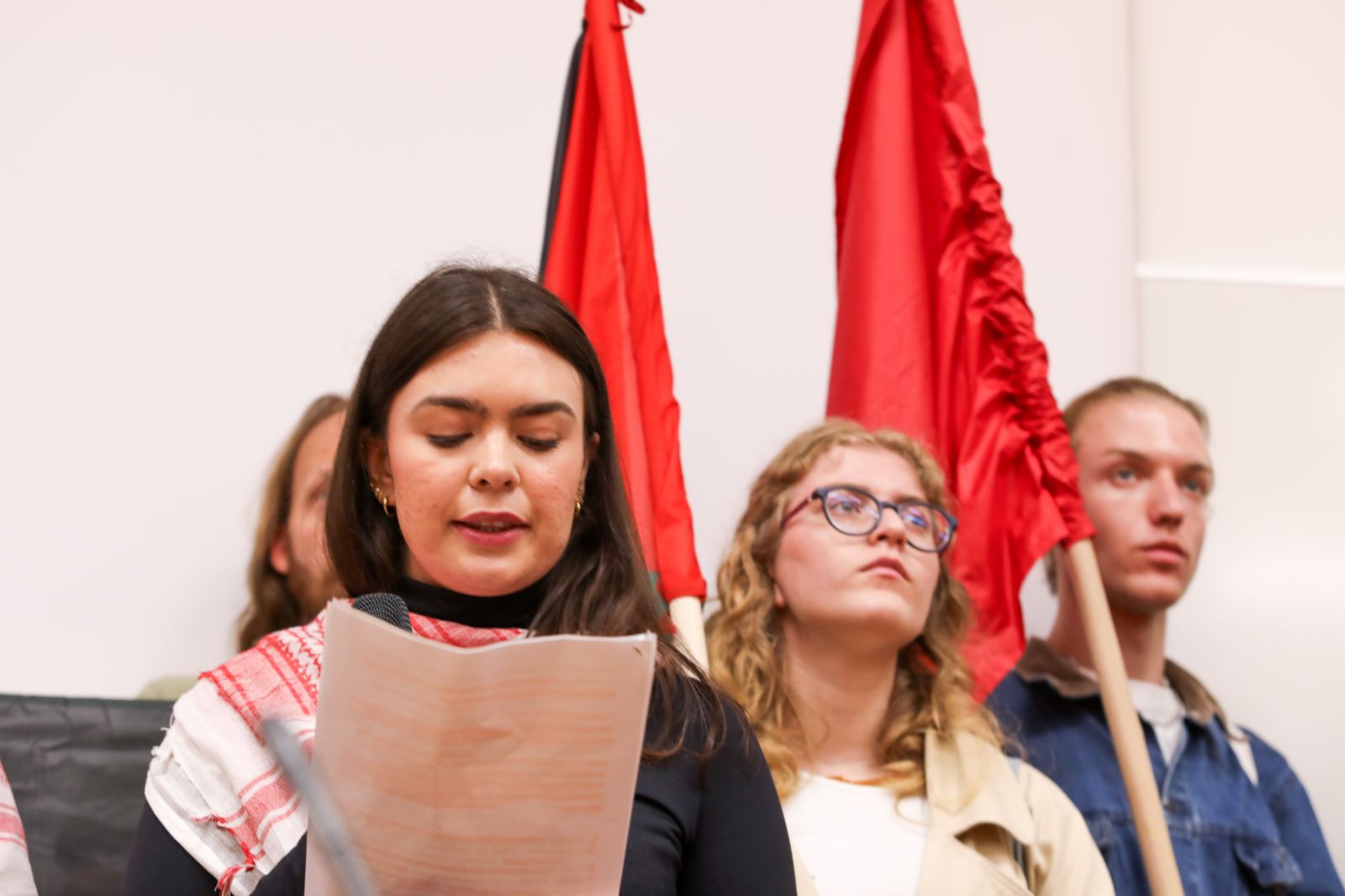 Tu smo in tu bomo ostali. Dovolj imamo sprenevedanja, dovolj imamo praznih obljub. Zahtevamo načelno univerzo, načelno fakulteto, ki stojita ZA dostojnost, ZA pravičnost, ZA svobodo! Svoboda Palestini!".