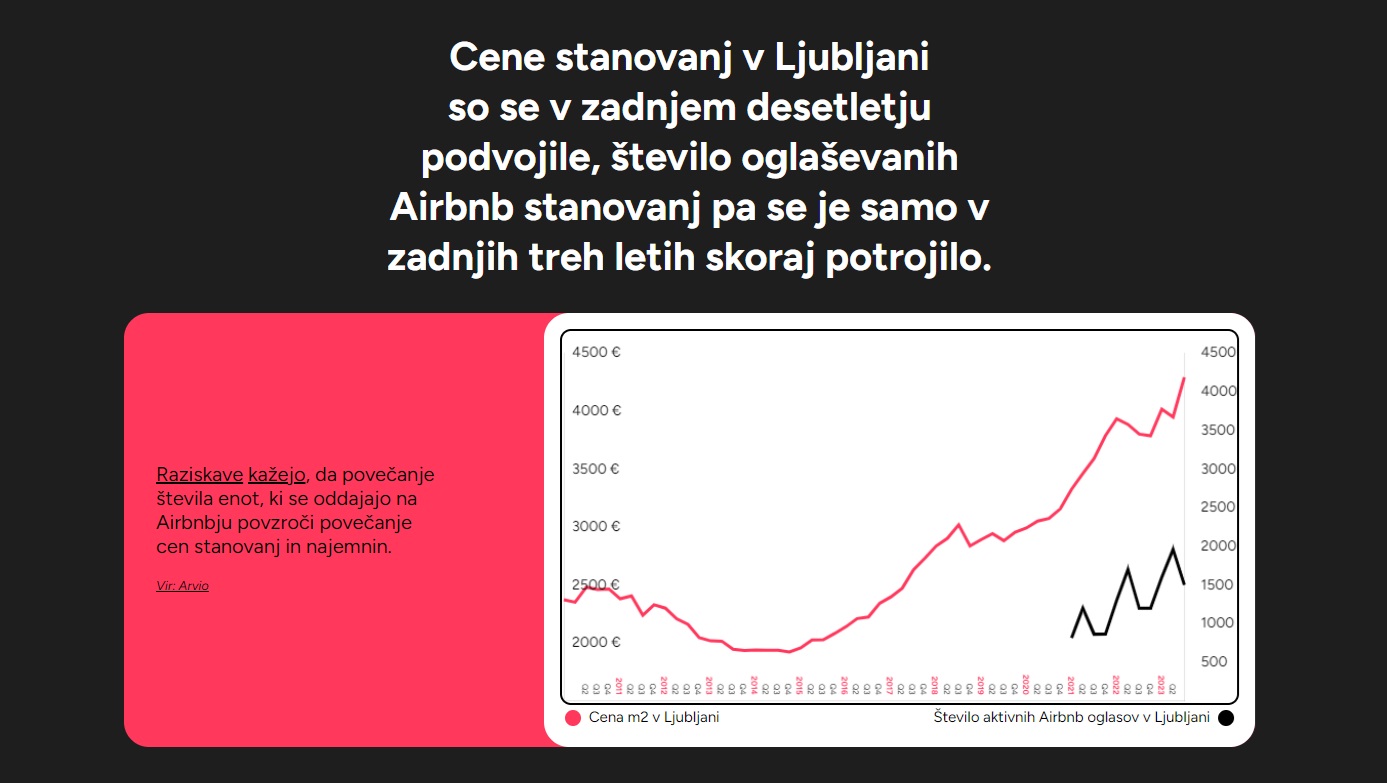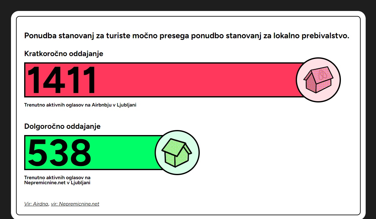 Ugotavljajo, da se Slovenija sooča z zgodovinsko stanovanjsko krizo, da so se cene stanovanj v zadnjem desetletju podvojile, da prebivalci Ljubljane za najem v povprečju odštevajo že več kot polovico plače, medtem pa se je zaradi eksplozije turizma in odsotnosti regulacije razcvetel trg kratkoročnega oddajanja. To pa poglablja krizo, saj zmanjšuje število dolgoročnih nastanitev na najbolj obremenjenih območjih.
