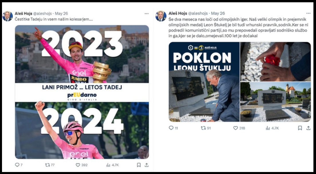 Za domoljubna čustva skrito ravnanje pa se lahko hitro sprevrže v golo samopromocijo in propagando. Ko je časopis Večer prvi opozoril na ravnanje dveh kandidatov za evropskega poslanca iz vrst SDS, se je prvi med njima, Franc Breznik, opravičil in umaknil svojo objavo. Nekdanji razvpiti minister za notranje zadeve Aleš Hojs je pri svoji zlorabi Leona Štuklja in Tadeja Pogačarja vztrajal in jo zagovarjal. Dejal je, da svoje objave ni umaknil, saj v njej, kot pravi, ne vidi ničesar spornega. Kaj točno je pri objavi fotografije zmagovitega Pogačarja storil?