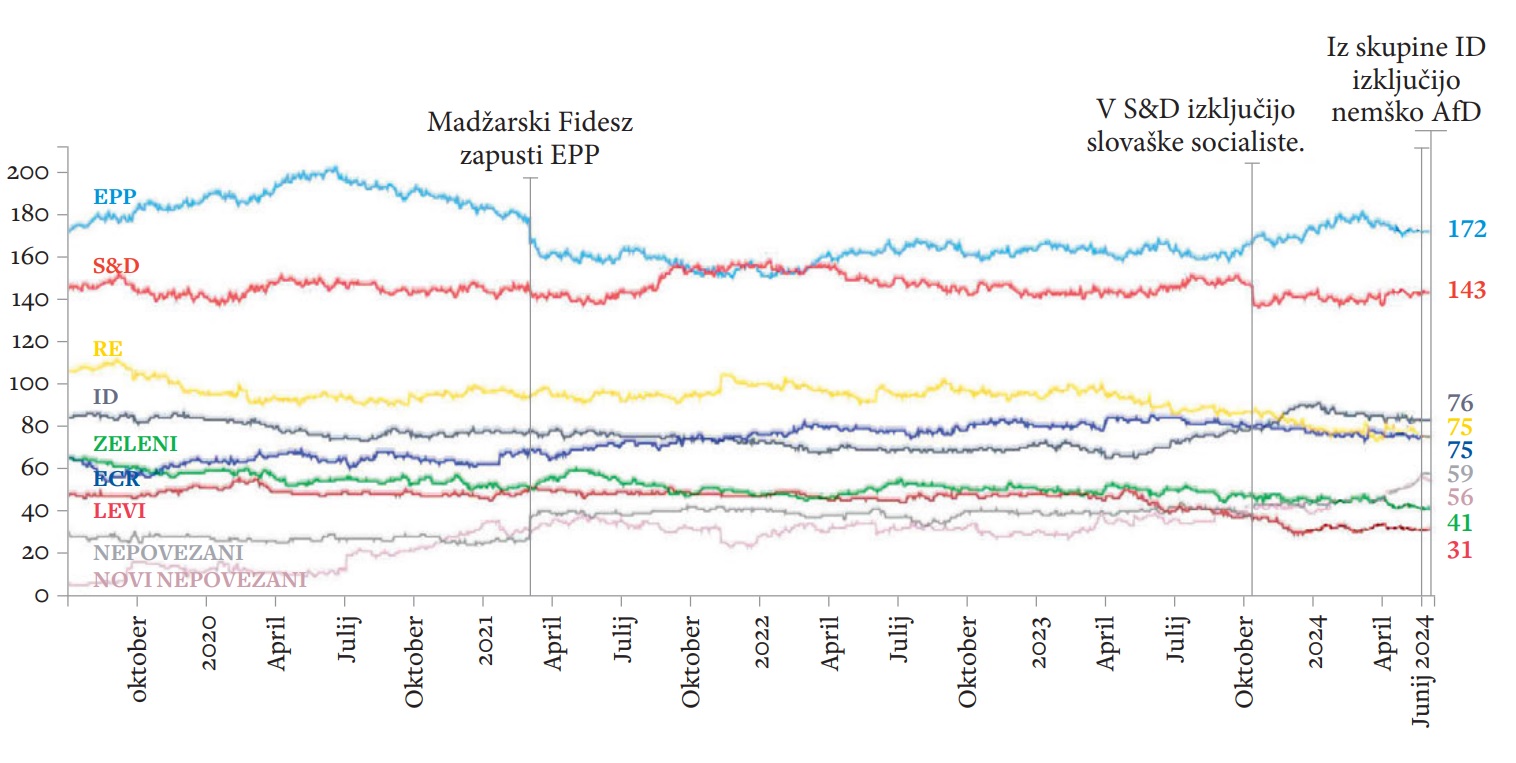 Na grafu je predstavljena ocena, koliko evropskih poslancev bi na volitvah v tem trenutku dobila posamezna evropska politična skupina. Graf je izdelan na podlagi raziskav javnega mnenja v posamezni državi, iz teh izsledkov nato na portalu Politico izračunajo število poslancev. Ocena je seveda približna in ni odvisna le od javnega mnenja, ampak tudi od spreminjajočega se članstva posameznih nacionalnih političnih strank v evropskih političnih skupinah, za povrhu pa ne tako redko politične skupine v Bruslju nekatere poslance tudi izključijo ali pa pridobijo nove. Iz grafa je razvidno, da je v EU največja politična skupina Evropska ljudska stranka EPP (svetlo modra), sledijo ji socialisti (S & D). Rumena barva predstavlja liberalce (Renew), zelena pa Evropske zelene. Poleg teh treh »koalicijskih« političnih skupin črna barva predstavlja skrajno desno skupino Identiteta (ID), temno modra pa manj skrajno desno skupino Evropskih konservativcev in reformistov (ECR), katere člani so predvsem poslanci poljske stranke Zakon in pravičnost. Temno rdeča barva na drugi strani političnega pola predstavlja skupino Evropska levica, katere članica je tudi slovenska Levica. Drugi poslanci niso vključeni v skupine.