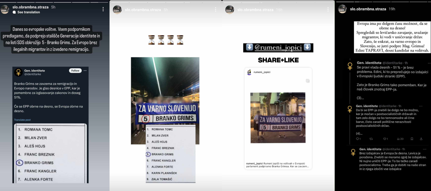 V zadnjih tednih je Grims deloval v povezavi s Slovensko obrambo stražo (SOS), rekrutirano iz poprejšnjih emanacij desnih ekstremističnih gibanj, ki so pri nas zadnja leta pod ideološkim sponzorstvom SDS vedno močnejša. Najbrž ni naključje, da se je SOS najbolj aktivirala tik pred volitvami in ves čas podpirala ravno Grimsa. Zato tudi njihova čestitka po njegovi izvolitvi v Bruselj, svojega favorita pa so lepo pozdravili tudi v Generaciji identitete in pri rumenih jopičih, ni nobeno presenečenje.