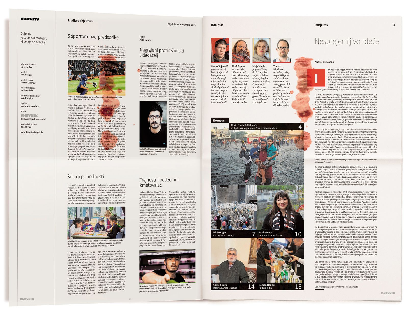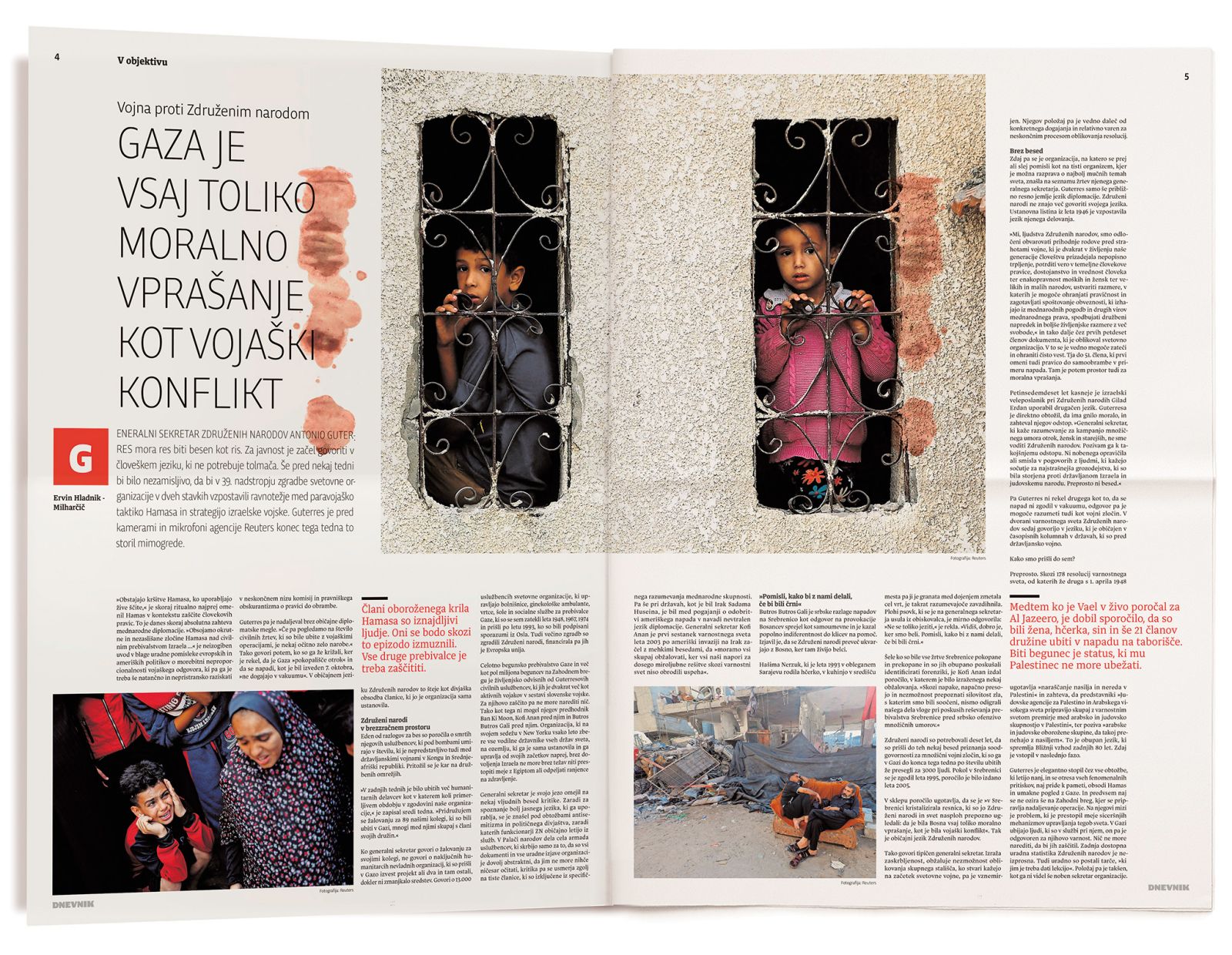 Krvavi klicaj na naslovnici Dnevnikovega Objektiva o Gazi: krvavi madež je bralce nato spremljal vse do zadnje strani.