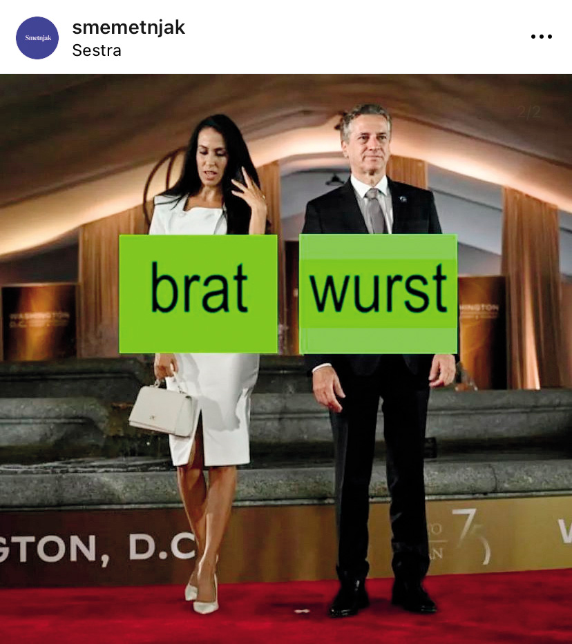 Fenomen »brat« je sprožil številne spletne meme, navdihnil je tudi slovenski kolektiv Smetnjak, ki je med drugim prevpraševal feminizem v kontekstu fenomena »brat« ter odnos med predsednikom vlade in njegovo partnerico. /