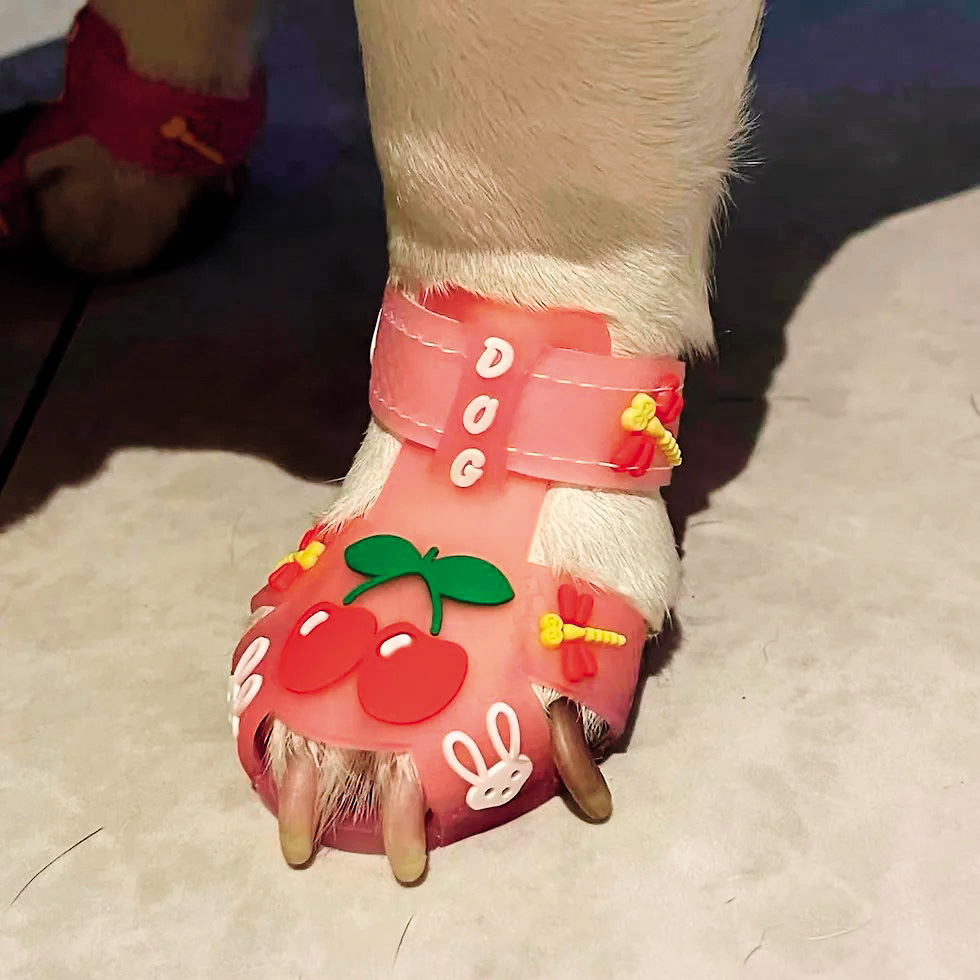 Razbeljena mestna tla v poletni pripeki za štirinožce pomenijo nevarnost, saj si lahko na njih opečejo blazinice, ki jih imajo na šapah. Ali je asfalt prevroč za pasje tačke, ugotovite s preizkusom sedmih sekund, pri katerem na pločnik položite hrbtišče svoje dlani: če zdržite manj kot sedem sekund, je podlaga vsekakor preveč razgreta, da bi nanjo spustili svojega ljubljenčka. K sreči pa lahko njegova stopala zaščitite s posebnimi obuvali, ki jih ponujajo zdaj že številni proizvajalci. Med njimi so tudi plastične sandale znamke Peekaboo Paws v modri, rumeni ali roza barvi, kot nalašč za poletne sprehode. Izdelujejo jih v nekaj različnih velikostih, za manjše in za velike pse. Med njihovo ponudbo lahko poleg sandal najdemo tudi bolj zaprte čevlje, pa posebne pasje nepremočljive dežne škorenjce iz silikona, celo pasje krokse, ki so verjetno namenjeni izključno statičnemu poziranju za fotografiranje, saj gre za natikače, v katerih s štirimi nogami ni mogoče hoditi; o tem priča tudi dejstvo, da so na prodaj v paru, pri ostalih modelih čevljev pa dobite štiri oziroma sami izberete želeno število kosov.