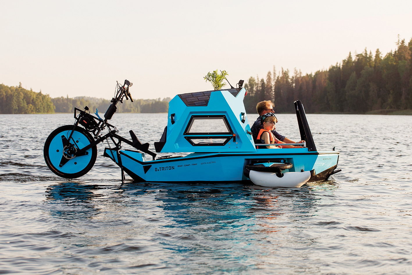 »Kaj je tisto modro na sredi morja, je to čoln, bicikel ali počitniška prikolica?« se bodo spraševali dopustniki, ko bodo prvič uzrli nenavaden konglomerat. Vse troje! Betriton je plovilo, vozilo in bivak v enem, Latvijec Aigars Lauzis pa je zamisel zanj dobil med svojim nekajletnim epskim kolesarjenjem od Londona do Tokia, ko je prevozil približno 30.000 kilometrov. Amfibijska prikolica je po potrebi lahko čoln, tricikel ali camper, zato je odlična nomadska počitniška namestitev za vse, ki jim je blizu narava in imajo radi razgibane počitnice. Zadeva v celoti deluje na električni pogon in je primerna za dve osebi. Z dvoživko lahko na primer raziskujemo mesta, podeželje, jezera, morje in obalo, pri čemer je treba potovati premišljeno ter vso odvečno kramo pustiti doma, saj prenese skupno obremenitev do dvesto kilogramov, nekaj takega pa tehta tudi sama. Največja hitrost, ki jo lahko dosežemo s čolnom, je osem kilometrov na uro, s triciklom je omejena na petindvajset. Trenutno zanjo zbirajo prednaročila, do kupcev naj bi prispela še letos. Betriton bo mogoče tudi najeti, vendar še ni znano, kje.