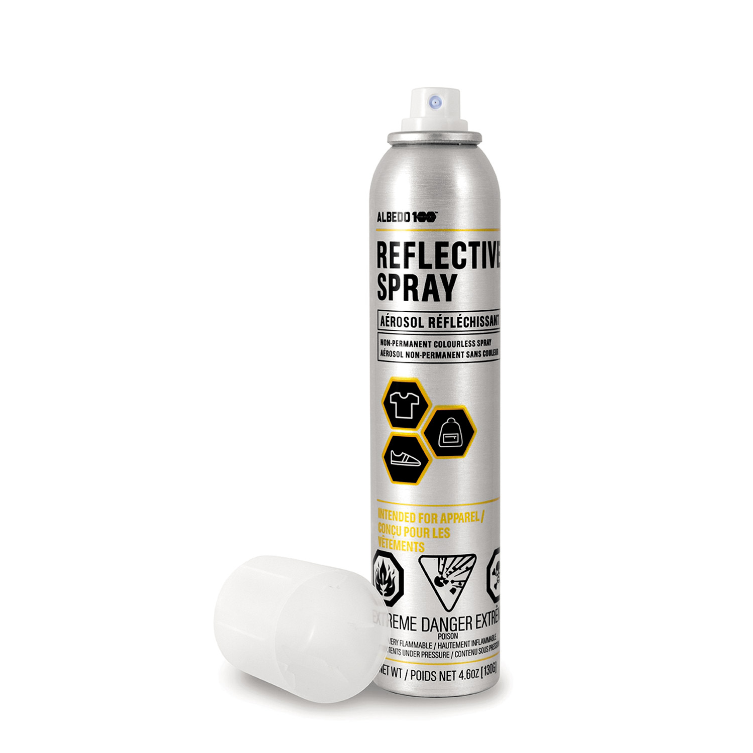 Sprej, ambiciozno poimenovan Albedo100, ki ga je zasnovalo švedsko podjetje enakega imena, odbija svetlobo ter tako poveča vidnost v mraku in ponoči, s čimer skrbi za boljšo varnost pešcev, kolesarjev, tekačev in ostalih. Albedo je sicer mera, ki pove, koliko svetlobe se odbije od opazovanega telesa. Izrazimo ga v odstotkih ter zavzema vrednosti med nič in ena – oziroma med nič in sto odstotkov. Kadar želimo biti v temi opaznejši, sprej nanesemo na obutev, oblačila, kolo, čelado ali druge športne rekvizite, nahrbtnik, otroški voziček ipd. Napršimo ga z razdalje trideset centimetrov. Rad se oprime skoraj vsake podlage, naj bo to les, beton, kamen, kovina ali tekstil, ne priporočajo le uporabe na usnju ali svetlečih se sintetičnih materialih. Vsekakor je pametno, da ga nanašamo na prostem. Pločevinko je treba pred uporabo dobro pretresti, paziti je treba, da pri pršenju ne pretiravamo, sicer pa je sprej prosojen in neopazen, dokler ga na primer ne obsijejo avtomobilski žarometi, svetilka ali fotografski fleš; sam od sebe se v temi ne sveti. Naneseni sprej ni vodotesen in se s pranjem ali potenjem izpere.