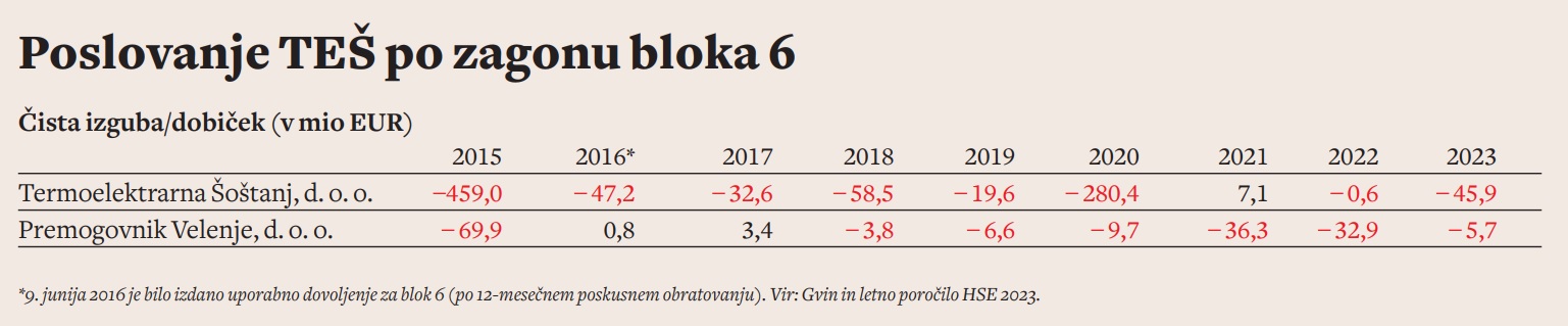 Trinajst let kasneje je jasno, da so se uresničile omenjene »zablode« in »nestrokovni argumenti«, od prihodnjega leta HSE ne bo več smel odkupovati elektriko od TEŠ po cenah nad tržnimi in pokrivati finančne luknje. Konec lanskega leta je imel TEŠ s 307 zaposlenimi še skoraj 300 milijonov evrov posojil (točneje 296,7 milijona), najetih za gradnjo bloka 6, kaže letno poročilo. Hkrati je lani TEŠ pridelal 45 milijonov evrov nove čiste izgube; od začetka obratovanja bloka 6 je TEŠ brez izgube posloval le leta 2021, ko je na podlagi zunajsodne poravnave prejel 231,8 milijona evrov od General Electric, pravnega naslednika graditelja Teš 6 Alstoma. Skupaj sta TEŠ in njegov dobavitelj Premogovnik Velenje v letih 2016–2023 pridelala krepko čez pol milijarde evrov čiste izgube (568,5 milijona evrov), dodatne izgube pa prihajajo; že naslednje leto vsaj 150 milijonov evrov.