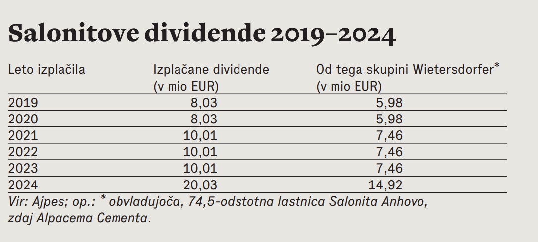 V Celovec se je iz Anhovega zgolj od začetka leta 2019 steklo slabih 50 milijonov evrov dividend, od tega rekordnih 15 milijonov evrov ravno konec avgusta letos, ko so lastniki izglasovali dividende iz lanskega dobička. Leto 2023 je bilo za Salonit spet rekordno; poleg 152 milijonov evrov prihodkov, za katere so zaslužni zlasti veliki (državni) infrastrukturni projekti, je skupina pridelala rekordnih 34 milijonov evrov čistega dobička. Poleg anhovske cementarne in sosežigalnice ima skupina Wietersdorfer v Sloveniji v lasti še podjetje InterCal iz Zagorja ob Savi in pol kamniškega Calcita, prek vseh treh podjetij in njihovih rudarskih koncesij pa že leta »monetizira« pomemben del slovenskega naravnega rudnega bogastva.