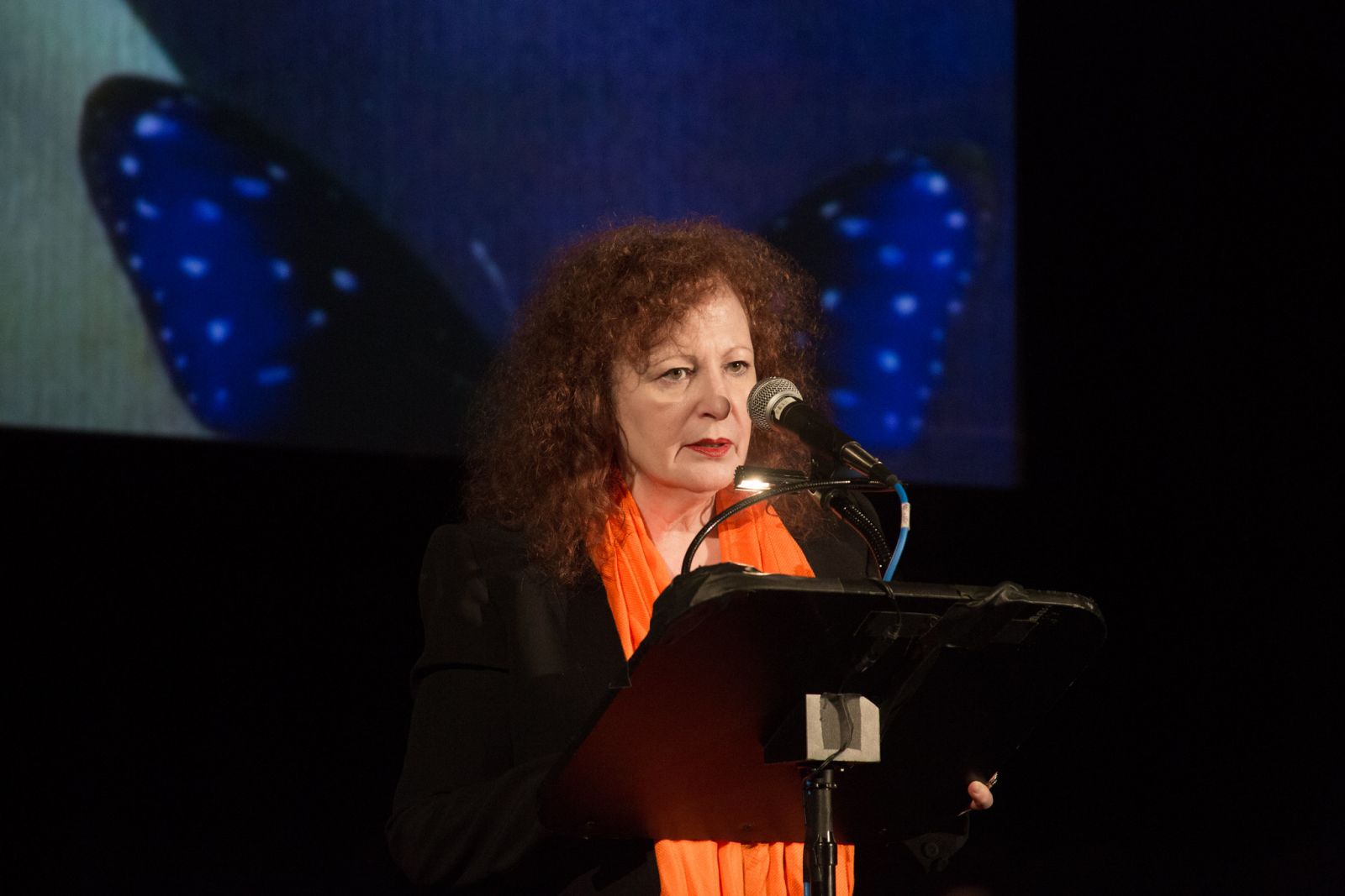 Goldin je svoj približno 14-minutni govor začela s štirimi minutami molka v spomin na smrtne žrtve s palestinskih območij, iz Libanona in Izraela "Sklenila sem, da to razstavo uporabim kot povod, da izrazim moralno ogorčenje nad genocidom v Gazi in Libanonu." Spomnila je, da je Nemčija domovina največje palestinske diaspore v Evropi. "Kljub temu se proteste zatira s policijskimi psi," je povedala.