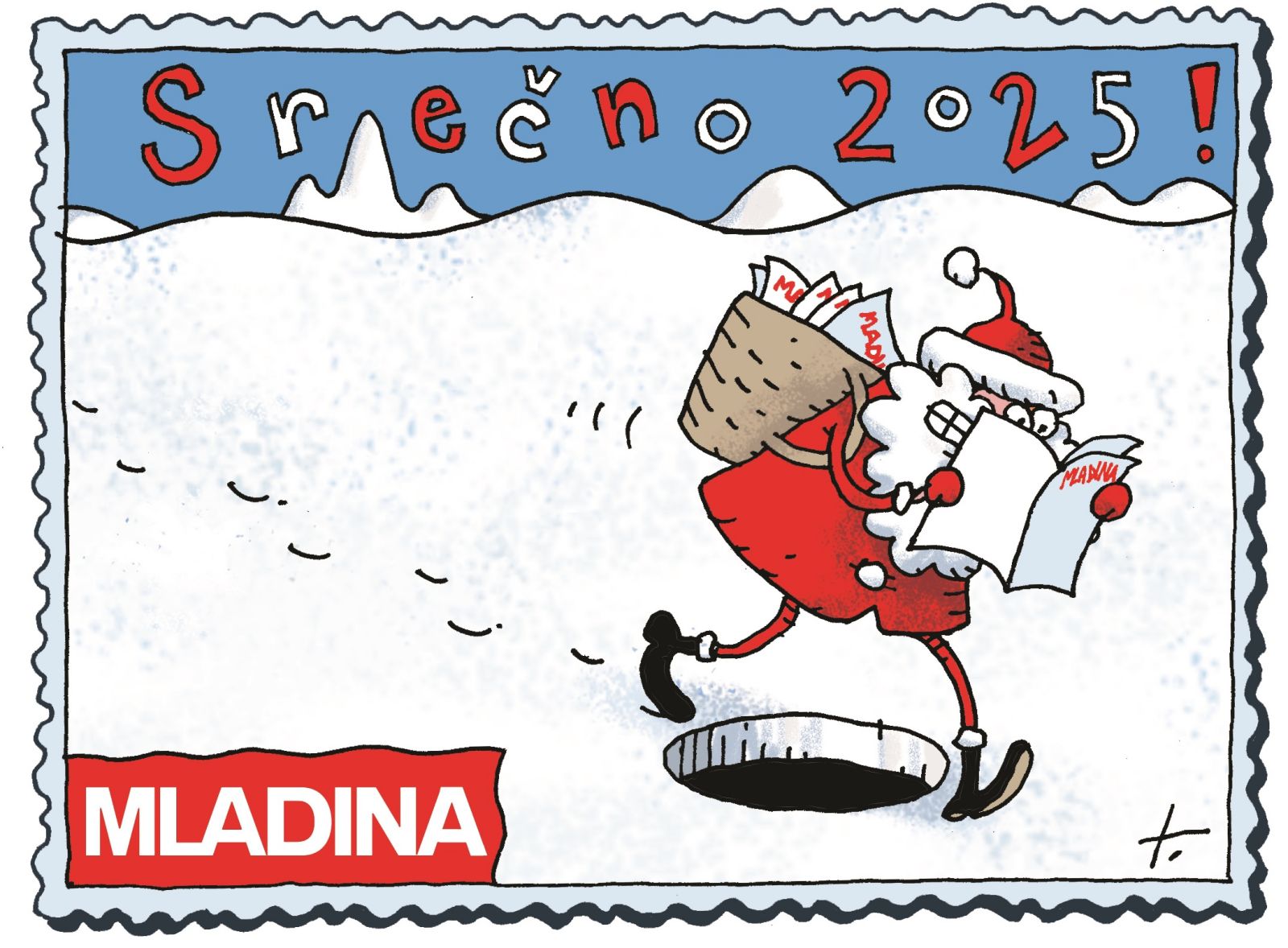 Novoletno voščilnico je ilustriral nagrajenec Prešernovega sklada in Mladinin hišni karikaturist Tomaž Lavrič. Srečno 2025!