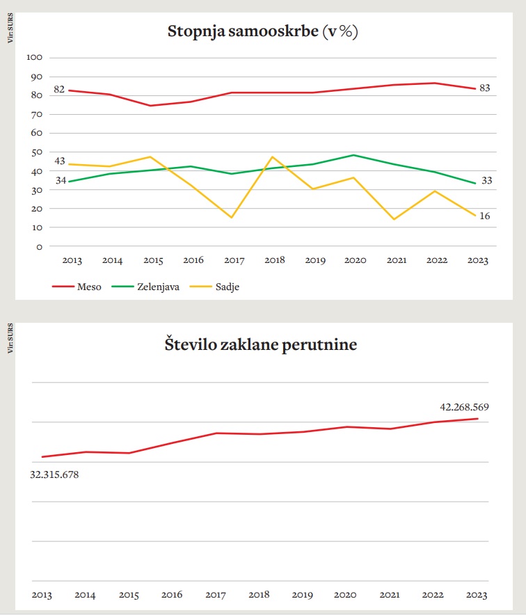 Statistični podatki so alarmantni: v letih 2021–2023 je v Sloveniji samooskrba s sadjem znašala od 14 do največ 29 odstotkov, samooskrba z zelenjavo pa je v istih treh letih padla s 43 na 33 odstotkov. Za lani, leto 2024, podatkov še ni, po prvih ocenah kmetijskega ministrstva pa naj bi bili vsaj pri vseh pomembnejših sadnih vrstah v intenzivnih nasadih doseženi »pomembno večji« hektarski pridelki. Bolj smo samooskrbni pri žitih in mesu, več kot 80-odstotno, ter pri jajcih, kjer smo tik pod 100 odstotki. Ob teh statistikah smo podrobneje pogledali, kam so v letu 2024 šle kmetijske subvencije, kaj v kmetijstvu je Slovenija spodbujala z javnim denarjem. In ugotovitve? Med sto največjimi prejemniki so bili (tudi lani) zlasti živinorejci in mesnopredelovalni giganti, številni v lasti tujcev, ki se osredotočajo na zvišanje dobička v širši regiji, bistveno več kot sadjarjev in zelenjavarjev pa je vinarjev.