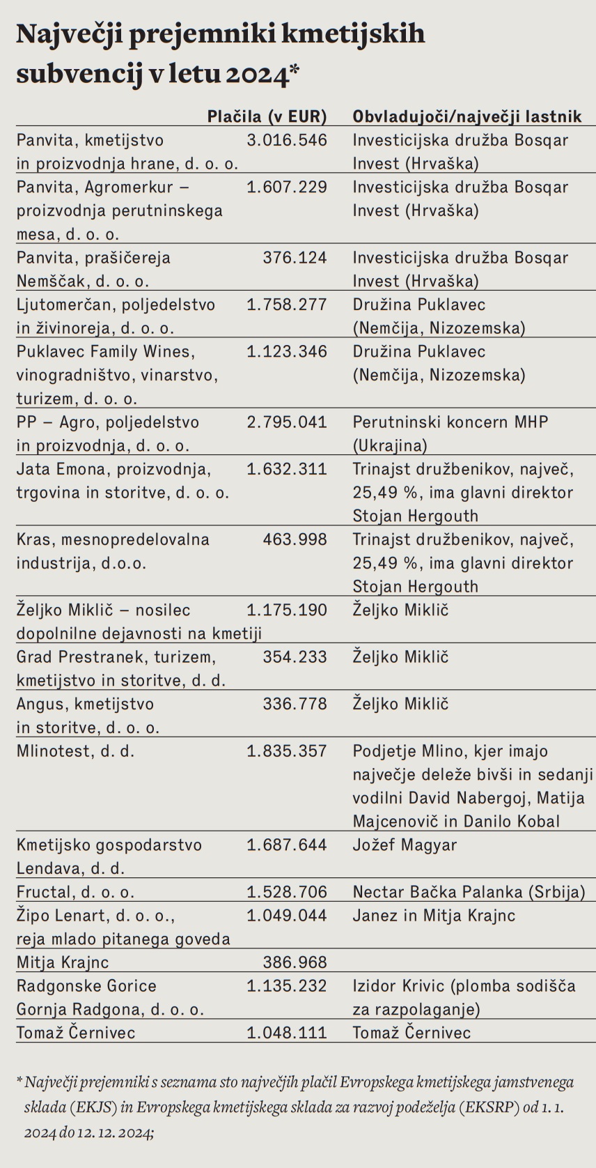 Ob Panviti in Perutnini Ptuj, kjer je v ospredju meso, je z dvema milijonoma subvencij v vrhu lanske lestvice še sorodna skupina Jata Emona, ki jo sestavljata matična krmilno-perutninska družba Jata Emona in mesnopredelovalna družba Kras. Skupina, ki je v letih 2020–2023 izkazala skoraj 28 milijonov evrov čistega dobička, ima razpršeno lastništvo, dobro četrtino obvladuje glavni direktor Stojan Hergouth. Za lažjo predstavo: Jata Emona je leta 2023 proizvedla skoraj 107,2 milijona jedilnih jajc. Več kot milijon subvencij sta prejeli tudi podjetji Žipo in Visoko, visoko na lestvici kmetijskih subvencij pa so tudi vinarji. Podjetji družine Puklavec – podjetje Ljutomerčan, ki vzreja prašiče in krmo zanje, ter vinarsko podjetje Puklavec Family Wines Ormož – sta skupaj prejeli 2,9 milijona evrov. Premoženje družine so pri Managerju nazadnje ocenili leta 2022 na skoraj 58 milijonov evrov. »Vir« premoženja je bil Vladimir Puklavec, ki je bogatel z globalnimi plinskimi posli, del denarja je nato pred 15 leti investiral v vinarsko-kmetijska podjetja v Ormožu in Ljutomeru, po njegovi smrti leta 2022 in dednih postopkih pa je od lani lastništvo krovnega holdinga Puklavec Family Wines, ki ima sedež v Ljubljani, razdrobljeno med dediče na Nizozemskem in v Nemčiji ter podjetji v Luksemburgu.