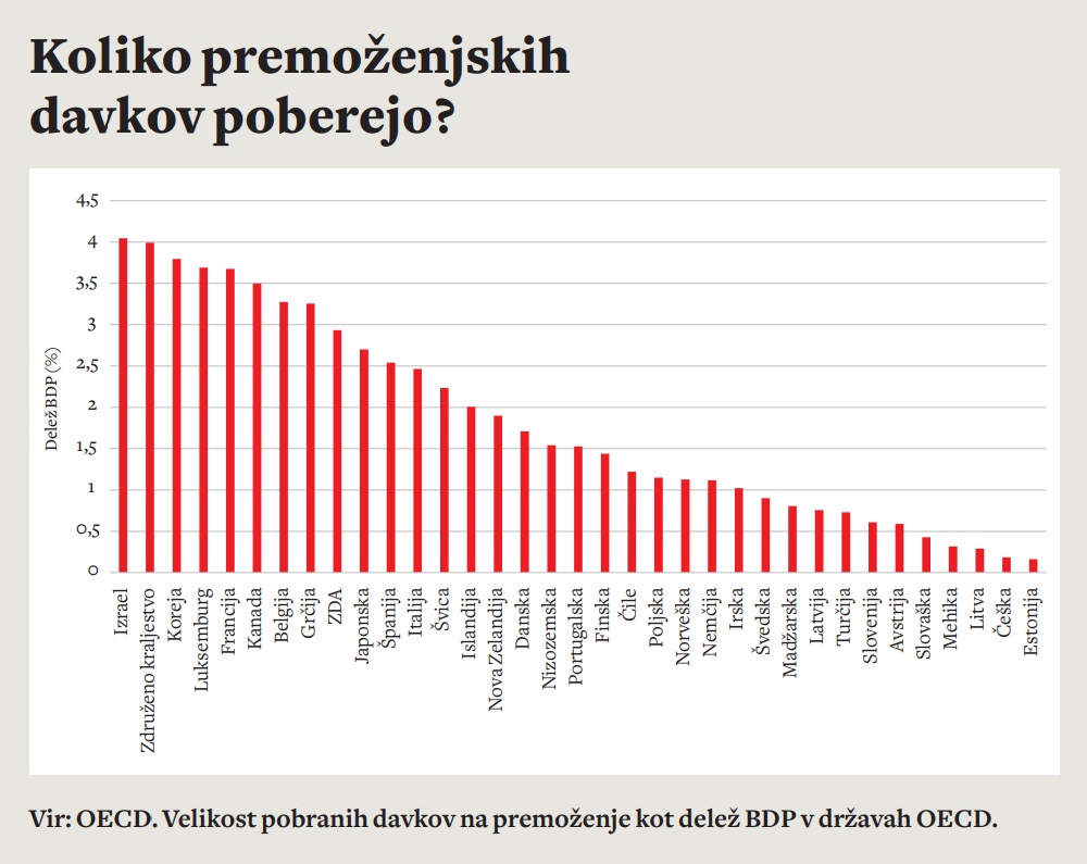 V Sloveniji trenutno prek različnih premoženjskih davkov, med katerimi je najpomembnejše nadomestilo za stavbna zemljišča, poberemo okoli 350 milijonov evrov davkov ali 0,6 odstotka BDP, kar nas uvršča na rep med državami članicami OECD po tem kriteriju. Koalicija sedaj poleg stavbnega nadomestila predlaga uvedbo premoženjskega davka, po katerem bi z 1,45 odstotka obremenili vse stanovanjske nepremičnine in gradbene parcele z nekaterimi izjemami. Podrobnosti sicer še niso jasne, ni še jasno, ali bo izvzeta le prva nepremičnina ali na primer prva nepremičnina do določene vrednosti. A če bo izplen tega davka znašal med 600 in 700 milijoni evrov, bi to Slovenijo po količini pobranih davkov na premoženje še vedno uvrstilo pod povprečje OECD, ki se giblje pri dveh odstotkih: z 1,77 odstotka BDP bi se približali Danski ali Nizozemski, bili pa bi daleč od Belgije ali Španije in Francije.