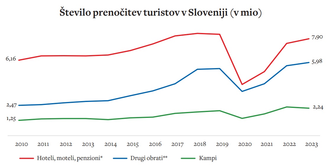Ministrstvo za gospodarstvo, ki ga vodi predsednik SD Matjaž Han, je tik pred novim letom objavilo javni razpis, na katerem ponuja 12,5 milijona evrov za gradnjo nastanitev za turiste, od hotelov do glampingov višje in visoke kakovosti, ter 2,7 milijona evrov za obnovo tovrstnih objektov. Gre za ponovitev razpisa; leta 2023 je ministrstvo za isti namen že razdelilo 58 milijonov evrov, vendar pa se četrtina takrat izbranih projektov ni realizirala in je več kot 15 milijonov evrov ostalo neporabljenih. Med drugimi sta od pogodbe odstopila ljubljanski hotel Slon in kar sedem od dvanajstih podjetij, ki so želela postaviti glampinge. Ob novem razpisu se odpira več vprašanj; zlasti, ali je smiselno vlagati toliko javnega denarja v nastanitve za turiste, in če že, ali res potrebujemo nove hotele, nove penzione in nove glampinge, namesto da bi vlagali v obnovo obstoječih hotelov in zmogljivosti, ki so v slabem stanju.