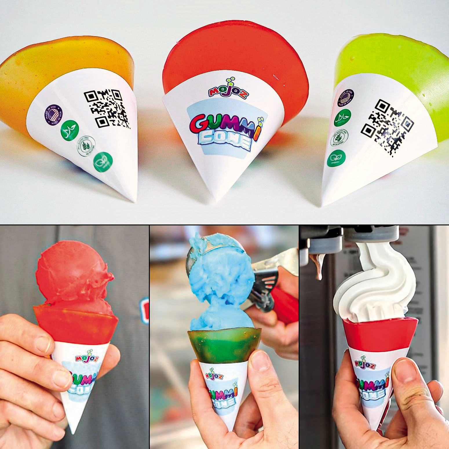 Sladoledni kornet je posoda za živilo, ki je priročna, prijazna do okolja in uporabnika, saj je užitna, če ne celo okusna. A ker so korneti izdelani iz tankega testa, se zgodi, da se razmočijo in začne stopljeni sladoled iz njih kapljati, poleg tega niso primerni za tiste, ki ne uživajo glutena. Doslej razen zmernega nabora velikosti, oblik, barv in dodatkov, kot so oblivi ter posipi, pa seveda brezglutenskih različic, korneti niso doživeli bistvene spremembe. Lani novembra pa so v ZDA predstavili spektakularno inovacijo, tako imenovani gummi cone, gumikornet. Kot že ime pove, je izdelan iz podobnih sestavin kot gumijasti bonboni, ki jih otroci praviloma obožujejo. Za zdaj gumikornete podjetje Mojoz izdeluje v treh različnih barvah oziroma okusih – jagoda, mango in limona. Ne vsebujejo glutena in so izdelani iz rastlinske želatine, primerni tudi za vegane. Ker so brez zašiljene konice, z ravnim dnom, funkcionirajo kot sklečke za sladoled, ki jih lahko postavimo na mizo ali vtaknemo v papirnat stožec, da jih je lažje držati v roki.