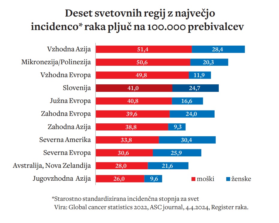 In kam se Slovenija uvršča ob mednarodnih primerjavah po pojavnosti pljučnega raka, za katerim vsako leto pri nas zboli več kot 1500 ljudi? »Svetovno gledano smo kar pri vrhu,« opozarja dr. Harlander in navede aprila lani objavljeno publikacijo Global cancer statistics 2022, ki temelji na posodobljenih ocenah Mednarodne agencije za raziskave raka (IARC) za svetovne regije. Med skupaj 20 regijami sta pri raku pljuč na 100.000 prebivalcev v vrhu Vzhodna Azija in regija Mikronezija-Polinezija, sledijo tri evropske regije – Vzhodna Evropa, Južna Evropa, v kateri je Slovenija, in Zahodna Evropa, sledijo pa Zahodna Azija, Severna Amerika in Severna Evropa. Če bi na to lestvico uvrstili Slovenijo in pojavnost pljučnega raka pri nas prevedli na (ugodnejšo) starostno strukturo svetovnega prebivalstva, bi Slovenija s pojavnostjo 41 primerov med moškimi in skoraj 25 primerov med ženskami na 100.000 prebivalcev pristala na četrtem mestu, z rahlo slabšo statistiko od povprečja »svoje« regije in opazno slabšo od na primer Severne Evrope, kjer so med drugim Švedska, Finska, Islandija, baltske države in Združeno kraljestvo. Na drugi lestvici pojavnosti pljučnega raka, ki jo navede dr. Harlander, to je na lestvici Evropske zveze farmacevtske industrije in združenj (EFPIA), se Slovenija med 31 državami uvršča na 21. mesto. Ta lestvica je leta 2018 zajela 28 držav EU, tudi Združeno kraljestvo ter Švico, Islandijo in Norveško, pojavnost pljučnega raka pa se je gibala od 40,1 primera na 100.000 prebivalcev na Švedskem do 113,6 primera na Madžarskem. Slovenija se je z 71,5 primera uvrstila na 21. mesto, slabšo statistiko so imele Francija, Hrvaška, Nizozemska, Poljska, Združeno kraljestvo, Nemčija, Belgija, Danska, Grčija in Madžarska. V tej primerjavi so upoštevali tako imenovano grobo incidenčno stopnjo, torej dejansko število novih primerov pljučnega raka, brez prilagoditev na starostno strukturo populacije kot pri omenjeni lestvici IARC.