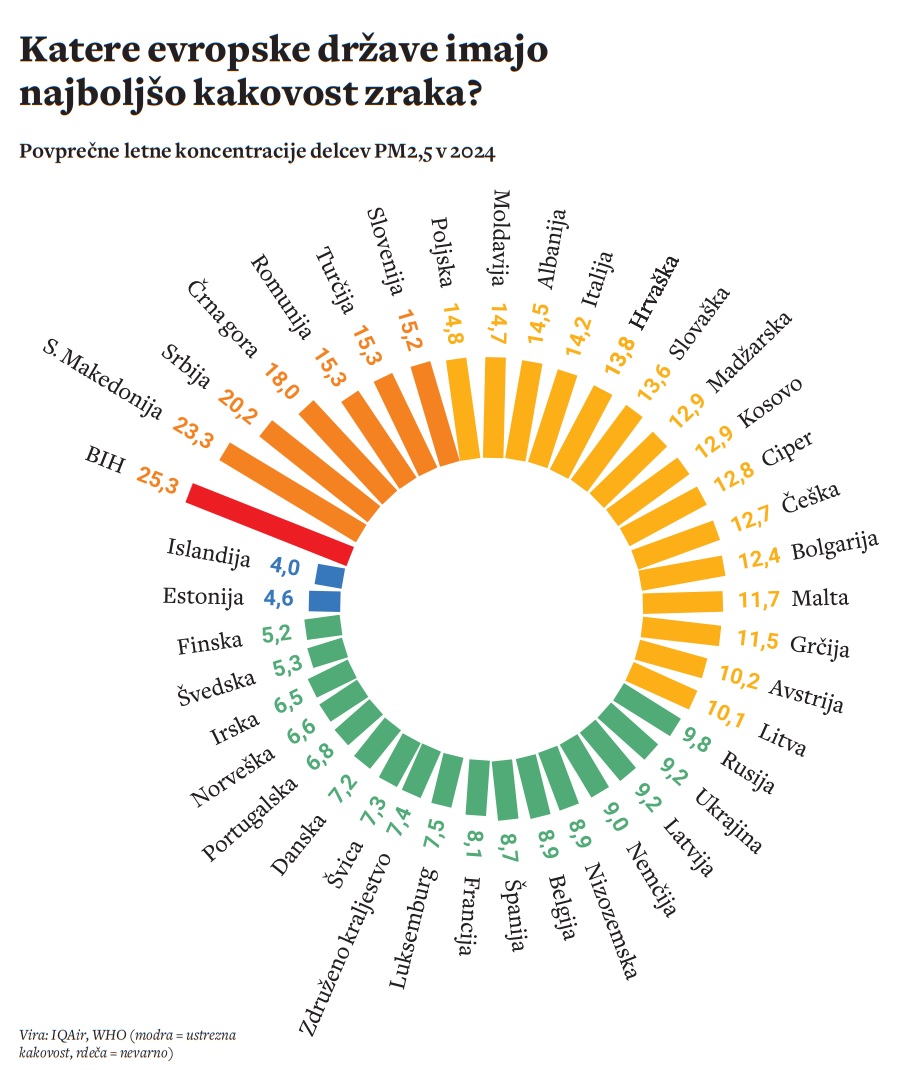 »Upoštevajoč celo državo je bila Slovenija leta 2024 68. najbolj onesnažena država med 138 v raziskavo zajetih držav. V tem letu je bilo onesnaženje največje, odkar spremljamo Slovenijo. Povprečna letna koncentracija delcev PM2,5 v letu 2024 je bila 15,2 mikrograma na kubični meter,« še dodaja Armen Araradian iz IQAir. Za primerjavo: pri Islandiji in Estoniji, ki sta se lani med 41 državami Evrope uvrstili najbolje, sta bili ti koncentraciji 4,0 in 4,6 mikrograma na kubični meter, pri najslabši BiH pa v povprečju leta 25,3 mikrograma na kubični meter zraka.