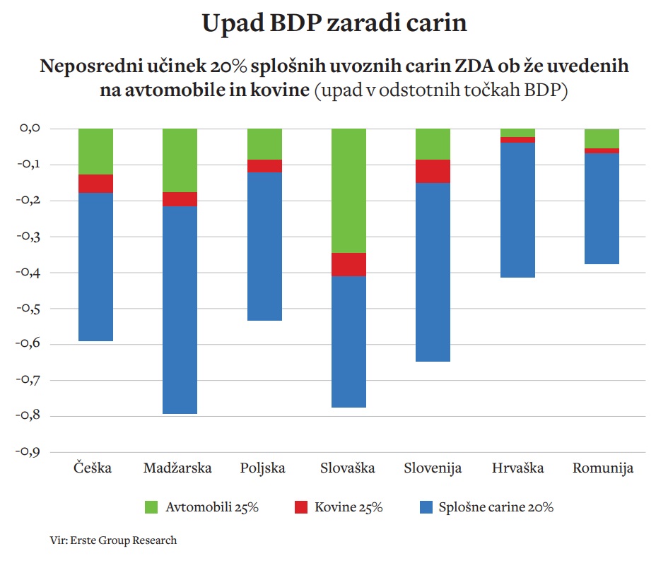 A analitiki zdaj seštevajo zlasti negativne posledice carin. V Erste bank so pred dnevi izračunali, da bodo ameriške carine – upoštevane so sicer zdaj zamrznjene 20-odstotne carine na že uvedene 25-odstotne na jeklo in avtomobilsko industrijo – med sedmimi vzhodno- in južnoevropskimi državami najbolj prizadele Madžarsko in Slovaško, njun BDP naj bi se zmanjšal za 0,8 odstotne točke. Sloveniji ob Češki in Poljski napovedujejo upad za 0,5 ali 0,6 odstotne točke. Vendar so ti izračuni vsaj za Slovenijo verjetno optimistični, saj ne vključujejo pomembnega posrednega učinka, ki ga bodo države čutile prek krčenja v vodilni avtomobilski proizvajalki, v Nemčiji. Revizijo napovedi gospodarskih rasti zaradi carin je v sredo že napovedala tudi Evropska centralna banka. Pod drobnogledom je zlasti Nemčija, münchenski inštitut IFO je že sredi marca napovedano rast nemškega gospodarstva za letos prepolovil z 0,4 na 0,2 odstotka.