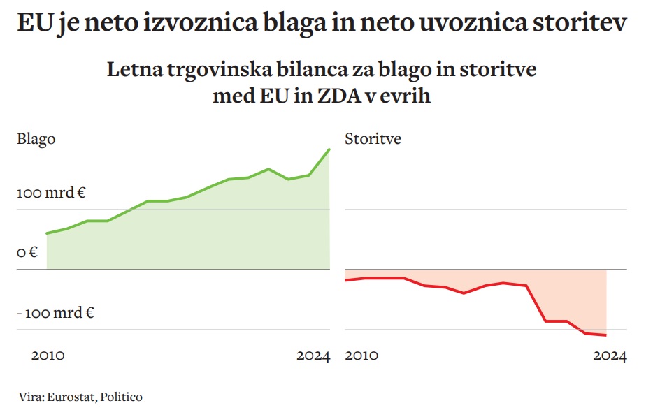 Največjo in najvidnejšo tarčo za protiukrepe EU sicer na hrbtu, kot karikirajo analitiki, nosijo ameriški ponudniki storitev, zlasti ameriški finančni in tehnološki sektor. Tudi priznani inštitut IFO kot primeren konkretni protiukrep poudarja »digitalni davek, ki bi močno prizadel ZDA«. Čeprav Trump striktno navaja le primanjkljaj ZDA pri blagovni menjavi z EU, je dejstvo, da imajo ZDA v trgovinski menjavi z EU presežek pri storitvah, v letu 2024 je bil ta kar 109 milijard evrov.