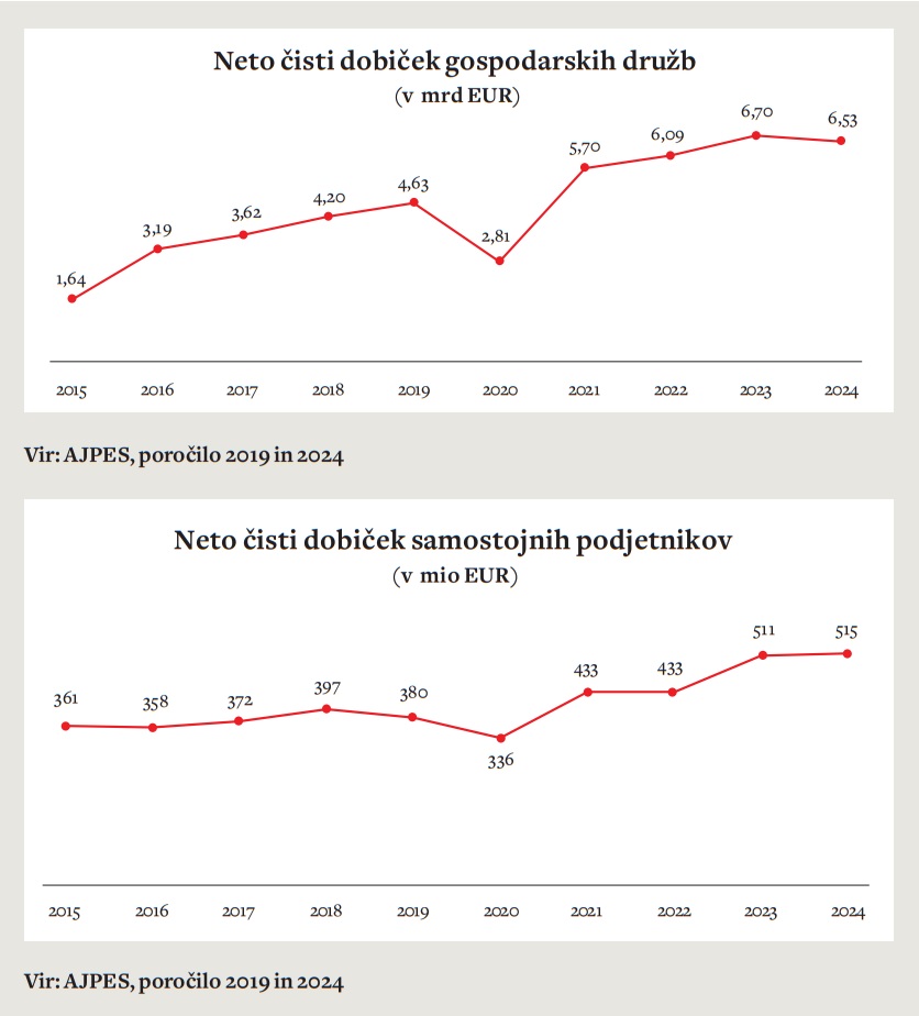 Podatki Ajpes namreč kažejo, da so gospodarske družbe lani skupaj izkazale 6,5 milijarde evrov neto čistega dobička, kar je drugo zaporedno rekordno leto z več kot 6,5-milijardnim neto čistim dobičkom (leta 2023 6,7 milijarde evrov), samostojni podjetniki pa so izkazali do zdaj najvišjih rekordnih 515 milijonov evrov dobička oziroma neto dohodka, v zadnjih dveh letih skupaj pa več kot milijardo evrov. V zadnjih dveh polnih letih »najhujše možne« vlade, če strnemo izpovedi funkcionarjev interesnih združenj, je torej naše gospodarstvo imelo zgodovinsko rekordne dobičke. Kljub nižanju napovedi gospodarskih rasti, ki se dogajajo globalno, nobena institucija Sloveniji za zdaj ne napoveduje recesije: po ta torek objavljeni napovedi OECD naj bi BDP Slovenije letos zrasel za 1,6 odstotka, EBRD in evropska komisija sta maja napovedala 1,9- oziroma 2-odstotno rast, za prihodnje leto pa vse tri napovedujejo 2,3- oziroma 2,4-odstotno rast.