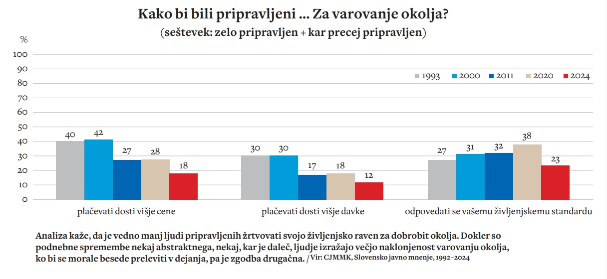 Zgodovinsko najmanjši je tudi delež vprašanih, ki so za ukrepanje pripravljeni žrtvovati svoje ugodje. Dosti višje cene je pripravljeno plačevati le še 18 odstotkov vprašanih (leta 2020 jih je bilo 28 odstotkov), višje davke 12 odstotkov (18 odstotkov leta 2020), življenjski ravni pa se je zaradi varovanja okolja pripravljeno odpovedati 23 odstotkov vprašanih, kar je bistveno manj kot leta 2020 (38 odstotkov) in primerljivo z letom 1993 (27 odstotkov).