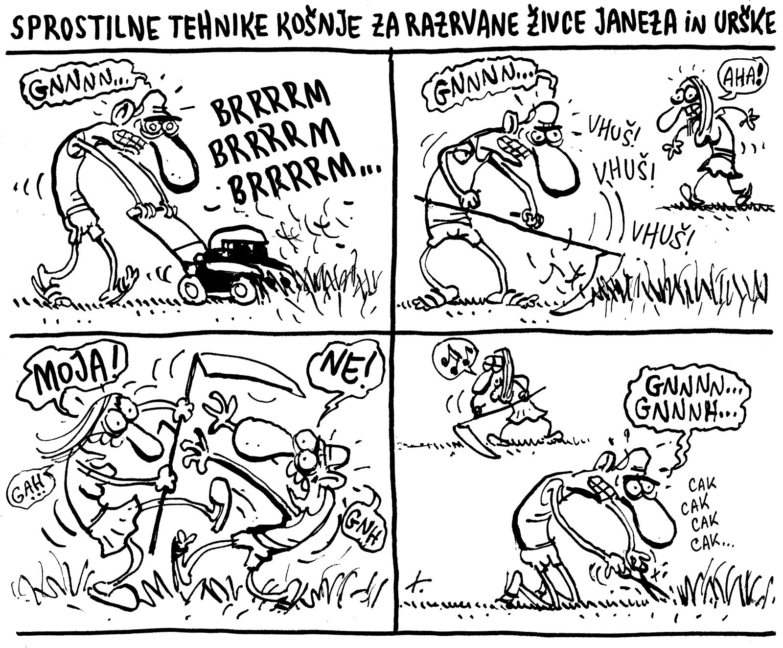 »Kosim travo. Obvladam vse orodje za košenje. Tudi navadno koso. To me sprošča. Sprošča tudi mojo ženo. Tako da se včasih tepeva za koso.«