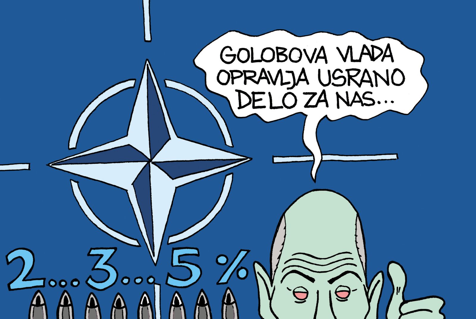 Toda zdaj je hudič vzel šalo. Le redki so to dojeli. Denimo španski premier Pedro Sánchez, ki je poudaril, da je 2,1 odstotka »dovolj in v skladu s španskim socialnim modelom«, ter da mu je španska vojska zagotovila, da lahko s tem odstotkom izpolni zahteve do Nata. Golob je ubral drugo taktiko. Koalicijske partnerje in javnost miri v slogu: »Taki sklepi ali deklaracije niso pravno zares zavezujoči.« Jih bomo že »nadmudrili«, nategnili. Koga? Pravzaprav oboje, domačo javnost in Nato. Sodeč po epilogu koalicijskega vrha, tudi SD in Levico. In kakorkoli katastrofalno, ni usodno, ali tri ali celo pet odstotkov, ampak kako ta koalicija postavlja prioritete. Tudi če bi s tem novim, vsiljenim obrambnim proračunom zgradili prepotrebni NUK, nekaj bolnišnic, šol, domov za ostarele etc., je pomembno, da se reče NE takšni destruktivni, militaristični politiki družbene regulacije in razvoja.