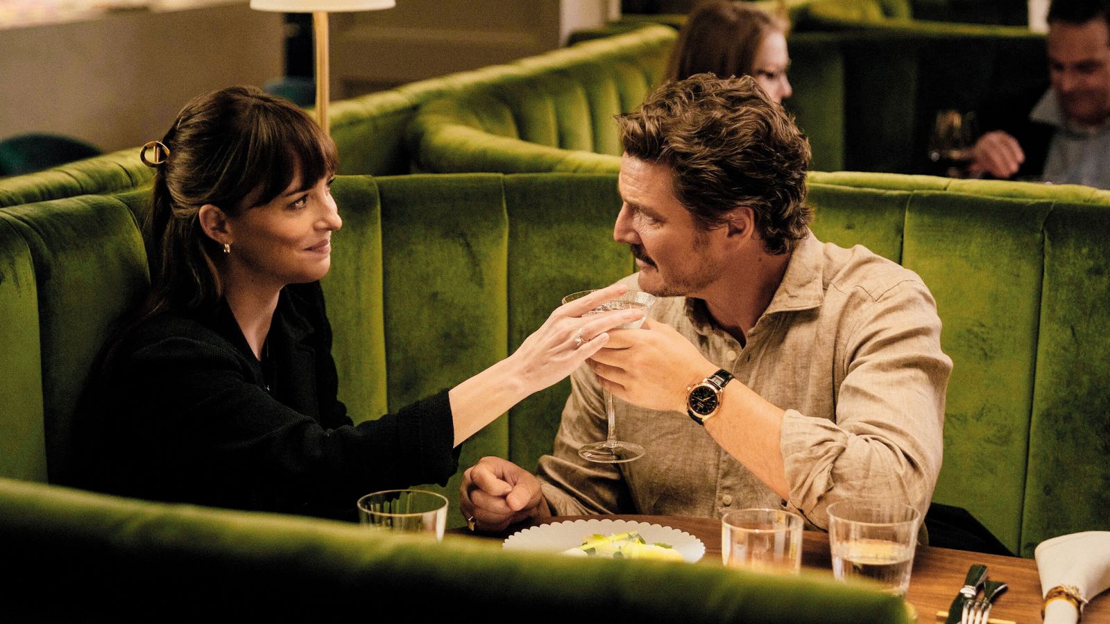 Popolna zveza je romantična komedija, ki ni komična, do romantike – romantične ljubezni – pa je skeptična. Zato se prolog odvrti v kameni dobi – med jamskimi ljudmi, sredi jamske romance, sredi »popolne zveze«. Kot romantična verzija Kubrickove klasike 2001: Odiseja v vesolju. In Popolna zveza, film Celine Song, avtorice Preteklih življenj, je res Odiseja – zgodba o vračanju domov, metazgodba pravzaprav, saj po eni strani popisuje vračanje povnanjene, svojemu bistvu odtujene romantične komedije k sebi, k »duhu« romantične komedije, po drugi strani pa orisuje vračanje ponovno združenih ljubimcev k svojemu izvoru, k prekinjeni, izgubljeni ljubezni. A vmes morata premagati hudo, strašno, največjo oviro – ljubezen. Lucy (Dakota Johnson) je ženitna posrednica – analogna verzija aplikacije za zmenke, analogni algoritem za popolno zvezo, perfect match, tinder za bogate. Zaposlena je pri prestižnem newyorškem podjetju, ki prestižnim možem išče žene in prestižnim ženskam može, jasno, na osnovi skupka lastnosti in preferenc (potencialnih ujemanj), ki ga klienti in klientke iščejo, a tudi sama Lucy, ki je sicer prepričana, da se z nikomer ne ujema, in ki svoj posel res obvlada (kopica njenih »posredovanj« se je končala s poroko, happy endom), postane le tinderski predstavitveni skupek lastnosti in preferenc, ko na zabavi – v duhu Petdesetih odtenkov sive – spozna Harryja (Pedro Pascal), atraktivnega, inteligentnega, razgledanega, duhovitega, nežnega, netoksičnega finančnika (private equity), skupek lastnosti in preferenc, ki bi bil perfect match za vsako njeno klientko (če ne že kar za vsako žensko). Vsaj tako meni Lucy, ki pa na isti zabavi – v vlogi natakarja – sreča svojega nekdanjega fanta Johna (Chris Evans), revnega, nesojenega igralca, ki še vedno – pri dobrih štiridesetih – živi s trumo cimerjev in ki ga je pred leti pustila zaradi finančnih razlogov, saj njegova falirana igralska »kariera« ni obetala ekonomske varnosti in stabilnosti. Ljubezni se je odpovedala iz strahu pred revščino.