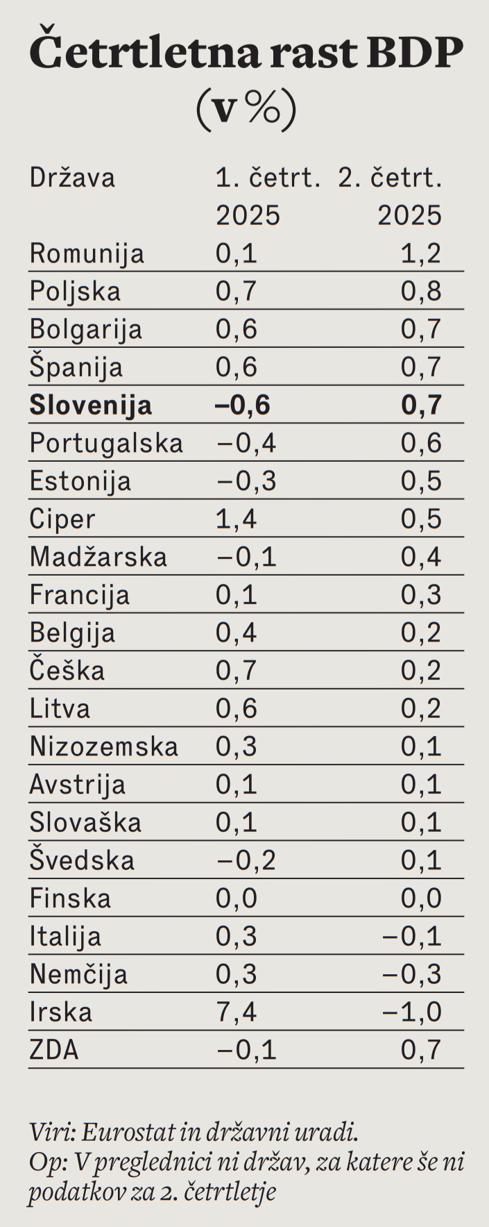 Izjavo, kako bi morali »zdaj zvoniti vsi alarmi«, je na novinarski konferenci prejšnji petek izrekel izvršni direktor Gospodarske zbornice za socialni dialog Mitja Gorenšček, ki je tudi eden od štirih državnih svetnikov, predstavnikov delodajalcev, skupaj s predsednikom državnega sveta Markom Lotričem. Gorenšček je z Bojanom Ivancem, analitikom zbornice, komentiral podatke o gospodarski rasti v drugem četrtletju, ko je po 0,6-odstotnem padcu v prvem četrtletju slovenski bruto domači proizvod zrasel, in sicer za 0,7 odstotka, kar je bila celo tretja najvišja četrtletna rast za Romunijo (+1,2 odstotka) in Poljsko (+0,8 odstotka), enaka (+0,7 odstotka) pa je bila rast tudi v Španiji in Bolgariji. Gospodarstvo sosednje Avstrije je recimo sočasno zraslo za 0,1 odstotka, Madžarske za 0,4 odstotka, za Hrvaško še ni podatka, gospodarstvi Italije in Nemčije pa sta se med aprilom in junijem celo skrčili za –0,1 in –0,3 odstotka. Ti podatki kažejo, da so in bodo letošnje rasti bruto domačega proizvoda, ki, na žalost, ostaja edino relevantno merilo uspešnosti držav, nizke povsod v EU – z edino izjemo Irske, kjer rast statistično napihujejo prihodki multinacionalk, ki so tam registrirane zaradi nizkih davkov.