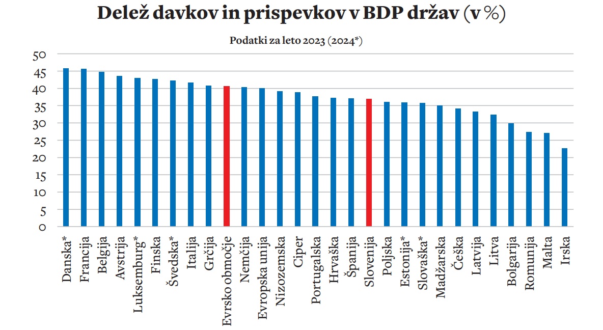 Razblinil pa se je še en podatek, ki ga vztrajno ponavljajo na Gospodarski zbornici. Euronews, vseevropska novičarska mreža s sedežem v francoskem Lyonu, je v torek objavila lestvico, ki kaže, kolikšen delež bruto domačega proizvodu (BDP) neke države pomenijo pobrani davki in prispevki. »Ti prihodki so za vlade ključno sredstvo za financiranje javnih storitev, kot sta zdravstvo in izobraževanje,« opozarjajo pri Euronewsu in dodajajo, da se kljub temu po Evropi močno razlikujejo. Na lestvici, ki povzema podatke Eurostata za leto 2023, je na prvem mestu Francija s 45,6 odstotnim deležem, sledijo ji Belgija, Danska, Avstrija, Finska, Švedska, Luksemburg, Italija, Grčija in Nemčija, ki imajo vse višje deleže od povprečja EU, ki je pri 40 odstotkih. V Sloveniji pobrani davki in prispevki pomenijo 36,9 odstotka bruto domačega proizvoda, kar jo na objavljeni lestvici uvršča pod povprečje, na 16. mesto med 27 držav članic, konkretno med Španijo in Poljsko. Za leto 2024 je Eurostat doslej objavil podatke le za pet držav, to je za Švedsko, Luksemburg, Slovaško, Estonijo in Dansko, in v zadnji so pobrani davki in prispevki lani dosegli 45,8 odstotka bruto domačega proizvoda, kar je rahlo več kot v Franciji leta 2023.