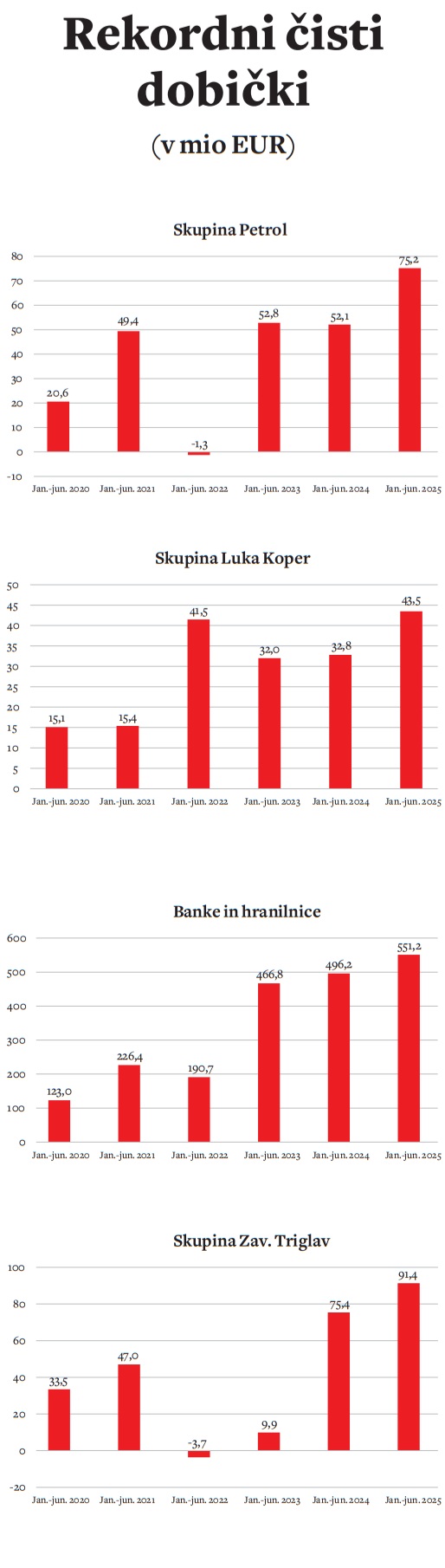 Tudi logistična družba Luka Koper je prejšnji četrtek objavila, da je »kljub zahtevnim razmeram in številnim negotovostim« v prvem polletju 2025 poslovala »zelo uspešno in presegla vse ključne finančne kazalnike«. Skupina je prihodke medletno zvišala za 15 odstotkov, čisti dobiček pa za 33 odstotkov na 43,5 milijona evrov. Med drugim so v Luki pretovorili 452.049 vozil, kar je deset odstotkov več kot v istem času lani, kar pripisujejo novim poslom, predvsem »uvozu vozil različnih kitajskih proizvajalcev ter izvozu v Evropi proizvedenih avtomobilov, namenjenih sredozemskim trgom«. Rekorden dobiček so imele tudi banke in hranilnice v Sloveniji: po podatkih Banke Slovenije je »naš« bančni sistem v prvem polletju letos prebil mejo pol milijarde čistega dobička (551 milijonov evrov), čisti dobiček pa je v istem času lani znašal 496 milijonov. To je dobra novica zlasti za večinske tuje lastnike bank. O rekordnem, za petino višjem medletnem čistem dobičku so pred dnevi poročali tudi iz skupine Zavarovalnice Triglav. Ti podatki seveda ne kažejo celostne slike, a spomnimo, da so gospodarske družbe zadnja štiri leta, 2021–2024, kumulativno izkazale zgodovinsko rekordne dobičke: po podatkih javne baze AJPES so v teh letih skupaj izkazale 25,01 milijarde evrov neto čistih dobičkov.
