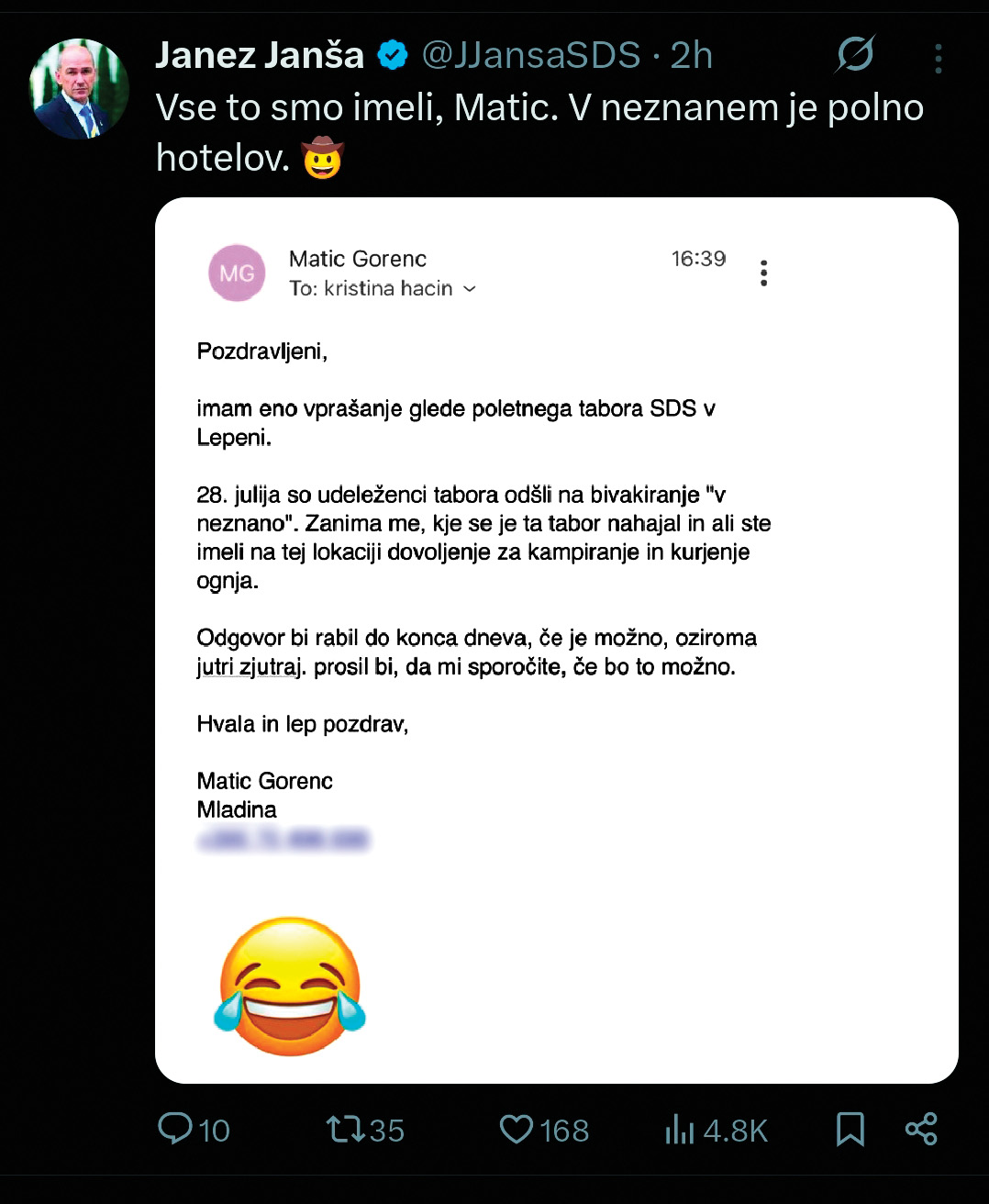 Na Mladini smo sprva poskušali doseči umik objave po uradni poti. Pritožili smo se informacijskemu pooblaščencu, ki je v preteklosti v podobnih primerih pogosto hitro ukrepal. A tokrat je našo pritožbo zavrnil z utemeljitvijo, da spada Janševa objava zasebne telefonske številke novinarja v okvir, citiramo »svobode izražanja«. V sklepu so zapisali: »Imetnik profila Janez Janša na družbenem omrežju X je z objavo izvrševal svojo pravico do svobode izražanja. Glede na naravo objave obdelava osebnih podatkov v obravnavani zadevi sodi v okvir 73. člena ZVOP-2.« Ta člen določa, da v primerih, kjer se osebni podatki uporabljajo v okviru svobode izražanja, informacijski pooblaščenec ni pristojen, saj je odločanje prepuščeno sodiščem.