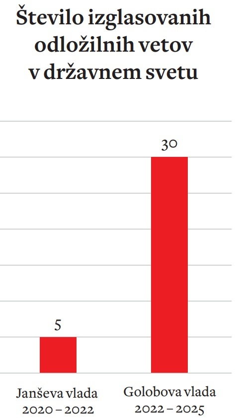 Vlada Roberta Goloba je na oblasti tri leta in štiri mesece. V tem času je državni svet izglasoval 30 odložilnih vetov na sprejete zakone, skoraj veto na mesec oziroma točneje na vsakih 40 dni. Njena predhodnica, tretja vlada Janeza Janše, je bila na oblasti dve leti in slabe tri mesece. V tem času je državni svet izglasoval vsega skupaj pet odložilnih vetov, torej dva na leto oziroma v dnevih – en veto na 165 dni. Državni svet je torej v obdobju Golobove vlade relativno gledano (začasno) ustavil štirikrat več zakonov kot v času prejšnje, Janševe vlade. V absolutnih številkah celo šestkrat več zakonov.