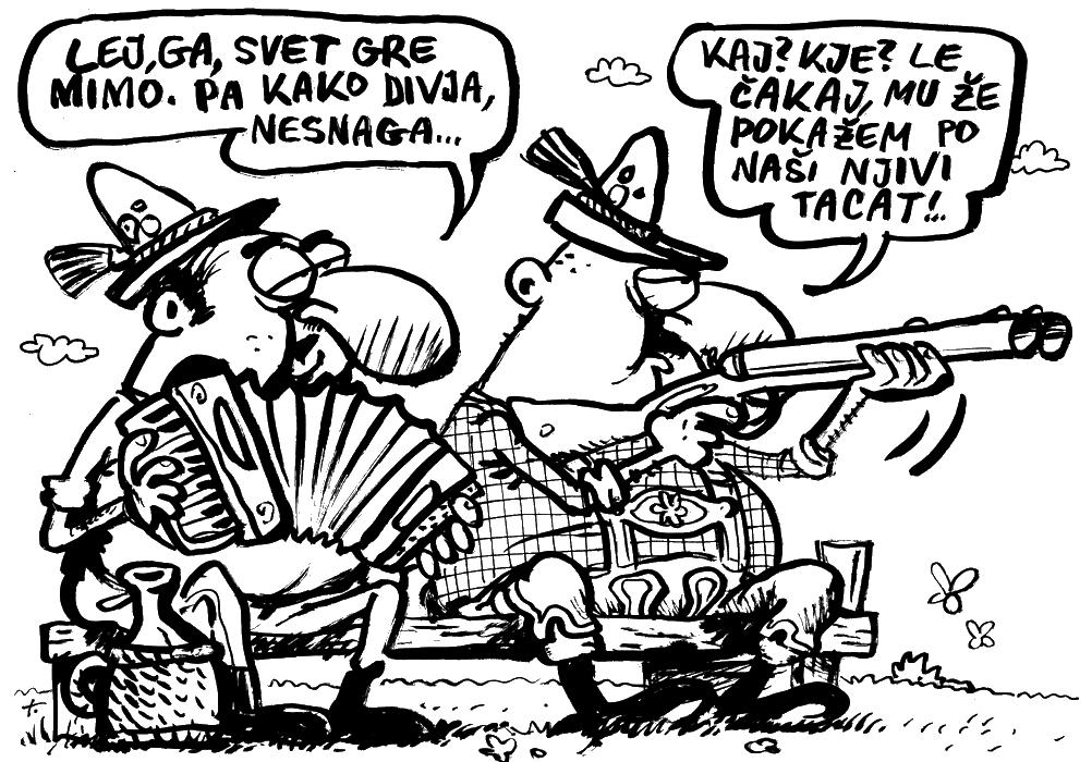 »Mi sedimo pod kozolcem, v irhastih hlačah, z lovskim klobukom na glavi in harmoniko v rokah in opazujemo, kako gre svet mimo nas.«