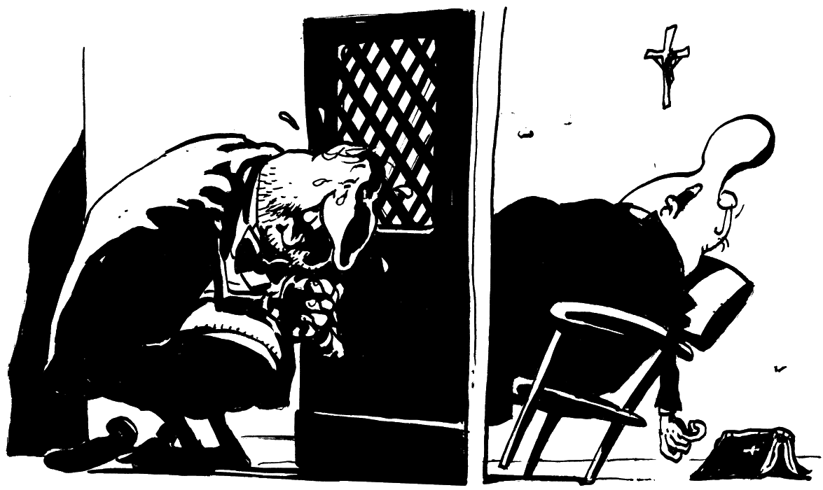 Spreobrnjeni Dimsi Rupsi hodi k spovedi in v nadaljevanjih pripoveduje o svojih grehih. (prvi dan je prišel le do sedemdesetih let in do poročanja udbi iz gnile amerike press)