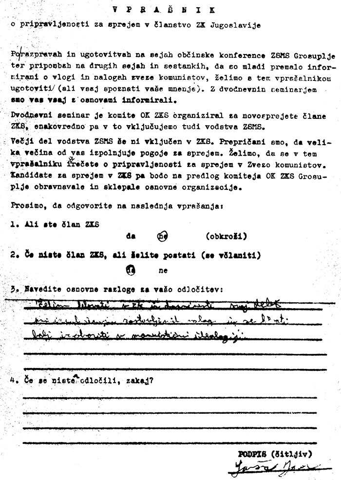 Objavljamo Vprašalnik o pripravljenosti za sprejem v članstvo Zveze komunistov Jugoslavije (za mlajše bralce: Partija, op. p.), ki ga je v drugi polovici sedemdesetih let (za mlajše bralce: svinčena leta komunizma, op. p.) izpolnil mladi Janez Janša. Dokument objavljamo zgolj zaradi verodostojnosti današnjega seciranja zločinske narave prejšnjega diktatorsko-komunističnega režima, ki ga je prejšnji petek na spletni strani SDS tako prepričljivo opisal prav Janez Janša v članku Boga ni. Vse je dovoljeno.