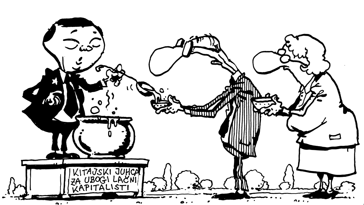 Veleposlaništvo Ljudske republike Kitajske je ob največjem državnem prazniku v ganjenosti spričo stavke javnih uslužbencev pripravilo velikanski sprejem, na katerem so s specialitetami kitajske kuhinje nahranili množico javnih uslužbencev: ministrov, državnih funkcionarjev, intelektualcev, novinarjev, umetnikov... (barbike ni bilo, ker skrbi za linijo press)