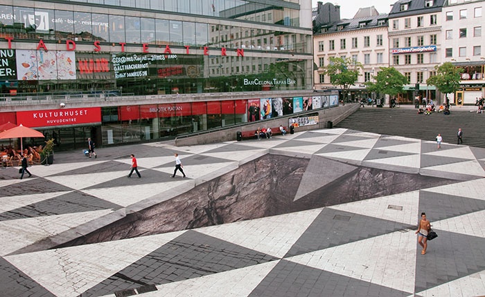 Turistom, ki se te dni mudijo v švedski prestolnici, se še sanja ne, da je pred poldrugim mesecem na trgu Sergels torg v samem središču Stockholma zijalo gigantsko brezno. Finto si je izmislil fotograf Erik Johansson, mojster retuširanja in manipuliranja fotografij. Petindvajsetletnik je svoje znanje in strast do nadrealnega uporabil za izdelavo tridimenzionalne optične iluzije zelo globoke luknje. Fotomontažo je natisnil na nekakšen topli pod in ga položil na površino trga, dolgo 32 metrov in široko 18 metrov. Instalacija, imenovana Mind your step, je korake mimoidočih beležila pet dni. Nihče izmed pešcev, ki so stopali prek trikotnega brezna, se bržkone ni pretirano ustrašil - podoba je bila od blizu namreč precej popačena, iluzija prepada pa najpopolnejša s perspektive na približno 18 metrov oddaljeni stopničasti platformi, ki so jo postavili za gledalce.