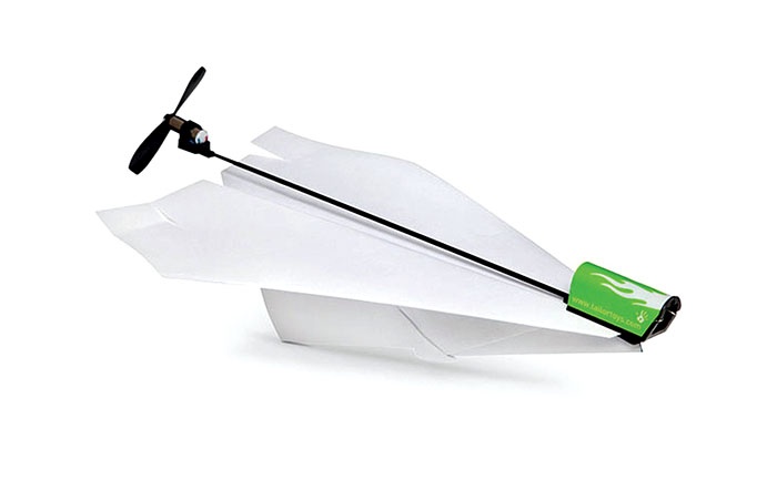 Papirnata letala so preprosta, poceni in fina igračka tako za odprte kot zaprte prostore. Če želite, da letalo, ki ga izdelate iz navadnega lista papirja, leti več kot le nekaj sekund, ga lahko opremite s posebnim električnim propelerjem. Imenuje se power up in je prvi ter doslej edini izdelek ameriškega podjetja Tailor toys, ki ga je ustanovil Shai Goitein. S pomočjo posebne sponke, ki jo zataknete za kljun letala, vezne prečke iz ogljikovih vlaken in propelerja, ki ga nataknete na drugi konec papirnatega aviončka, bo ta ostal v zraku celih 90 sekund. Seveda morate propeler prej nafilati s pomočjo posebnega polnilca. Ta deluje na navadne baterije, eno polnjenje propelerja za poldrugo minuto poleta pa traja 20 sekund. Igračko priporočajo starejšim od osem let in je za zdaj na voljo le prek spleta.