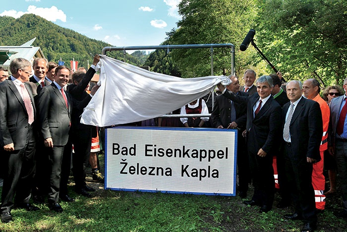 Postavitev prve od 72 novih dvojezičnih tabel na avstrijskem Koroškem, Železna Kapla, Avstrija