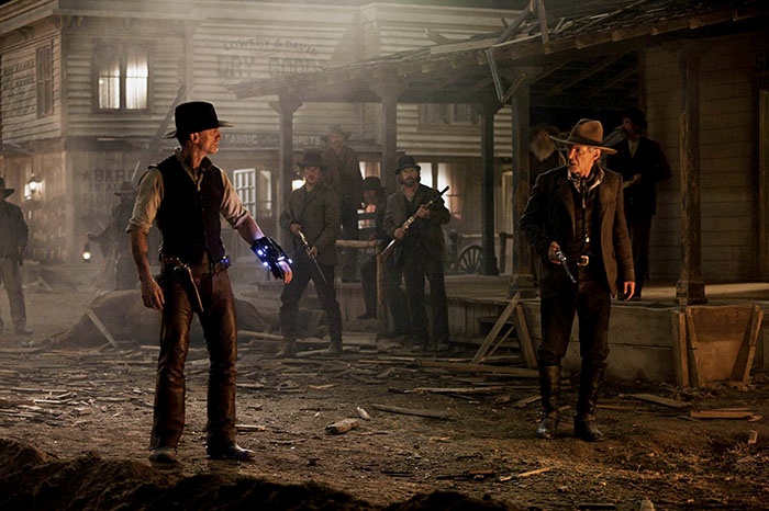 Zdaj, dobrih 20 let kasneje, se Bond in Indy spet združita. Spet se združita na tujem teritoriju - ne v divji Evropi, ampak na divjem zahodu. Divjem divjem zahodu, pravzaprav. In spet za združitev potrebujeta dober izgovor - invazijo zunajzemeljskih bitij. Za oba je to nova izkušnja. Daniel Craig, še včeraj James Bond, se zbudi sredi arizonske puščave - nima pojma, kako mu je ime. Nima pojma, kdo je. Nima pojma, od kod prihaja. Mož brez imena. In brez preteklosti. Na roki ima kovinsko zapestnico, ki izgleda futuristično, še toliko bolj, ker se film dogaja leta 1871. Če bi mu bilo ime James Bond, potem bi temu, kar ima na roki, rekli gadget. Ko prijezdijo lovci na glave, tipični raztrganci iz umazanih seventies vesternov, jih razmeče, pokolje in postreli. Kolt zavrti na prstu in ga sune v tok. Man with No Name pač, groteska bibličnega maščevanja. Če ne bi tekoče govoril angleško, bi mu rekli Terminator, toda oblačila in obutev pobitih lovcev na glave si potem natakne kot Terminator. In ko odjezdi v bližnje mesto, najde dovolj razlogov, da je Shane, Mož, ki je ustrelil Libertyja Valancea, Mož iz Laramieja in Man with no Name v eni osebi: mesto - zakotno, anarhično, ustrahovano - je namreč talec in obenem posest polkovnika Woodrowa Dolarhydea (Harrison Ford), mogočnega, tiranskega, tajkunskega, smrtno resnega živinorejca (z arogantnim sinom), veterana ameriške državljanske vojne. In ne kličite ga polkovnik: »Večina tistih, ki so me klicali polkovnik, je mrtvih.« Toda še preden bi lahko film nakazal vse razredne prepade in vse aspekte izkoriščanja, kavbojsko mesto že doživi svoj Dan neodvisnosti - okej, svoj Cloverfield, svojo Vojno svetov, svoje Bližnje srečanje tretje vrste. Spielbergovsko Amerikano napadejo gigerjevski »osmi potniki«, vesoljski zavojevalci - hja, podobno kot malo, zakotno spielbergovsko mesto v filmu Super 8.