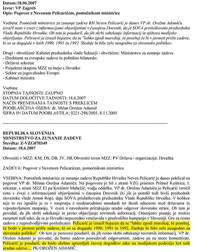 Depeša, ki jo je slovenski veleposlanik leta 2007 poslal v kabinet premieru Janezu Janši, razkriva, da je Hrvaška zagrozila z objavo obremenilnih dokumentov za slovensko politiko iz let 1990, 1991 in 1992. Dva meseca po grožnji je Janša privolil v zahtevo Zagreba, da se mejni spor rešuje pred haaškim sodiščem, kar bi za Slovenijo pomenilo daleč najslabše izhodišče. Pozneje skuša sicer Janša dogovoru zmanjšati pomen, češ da na Bledu ni bil sklenjen noben sporazum in da ni bilo mogoče uskladiti niti skupne izjave. Toda po tem dogovoru poti nazaj k sporazumu Drnovšek-Račan ali k reševanju spora na podlagi politične mediacije ni bilo več. Zaradi tega je bila tudi slovenska blokada Hrvaške v očeh mednarodne skupnosti neupravičena. Tako Evropska komisija kot tudi Evropski parlament sta ob slovenski blokadi tej Slovenijo spomnila na sporazum z Bleda, kjer je Slovenija že privolila v sodno reševanje spora. Da je bil v očeh mednarodne skupnosti sporazum sklenjen - po mednarodnem pravu zadošča že beseda predsednika vlade in Janša tedaj tudi ni popravil izrečenih Sanaderjevih besed - pa pričajo tudi prejšnji teden objavljene ameriške depeše. Janša je tedaj v koncesijo Hrvaški privolil tudi brez poprejšnjega dogovora z opozicijo. Pred srečanjem so namreč vodje parlamentarnih strank soglašali vključitvi tretjega v reševanje spora, ne pa, da lahko predsednik vlade privoli v reševanje na Meddržavnem sodišču v Haagu.