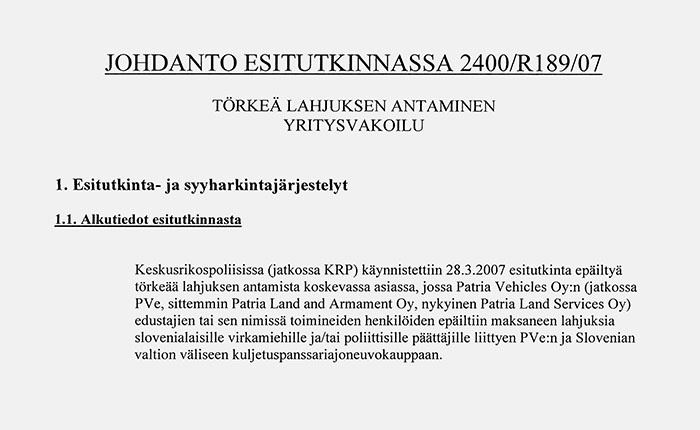 Nacionalni preiskovalni urad je 28. marca 2007 začel preliminarno preiskavo v zadevi, povezani s sumom podkupovanja. Predstavniki družbe Patria Vehicles Oy (kasneje PVe, nato Patria Land and Armament Oy, sedaj pa Patria Land Services Oy), oziroma osebe, ki so delovale v njenem imenu, so bile osumljene, da so plačale podkupnino slovenskim (vladnim) predstavnikom in/ali politikom, in sicer v povezavi s poslom z osebnimi oklepnimi vozili med družbo PVe in državo Slovenijo.