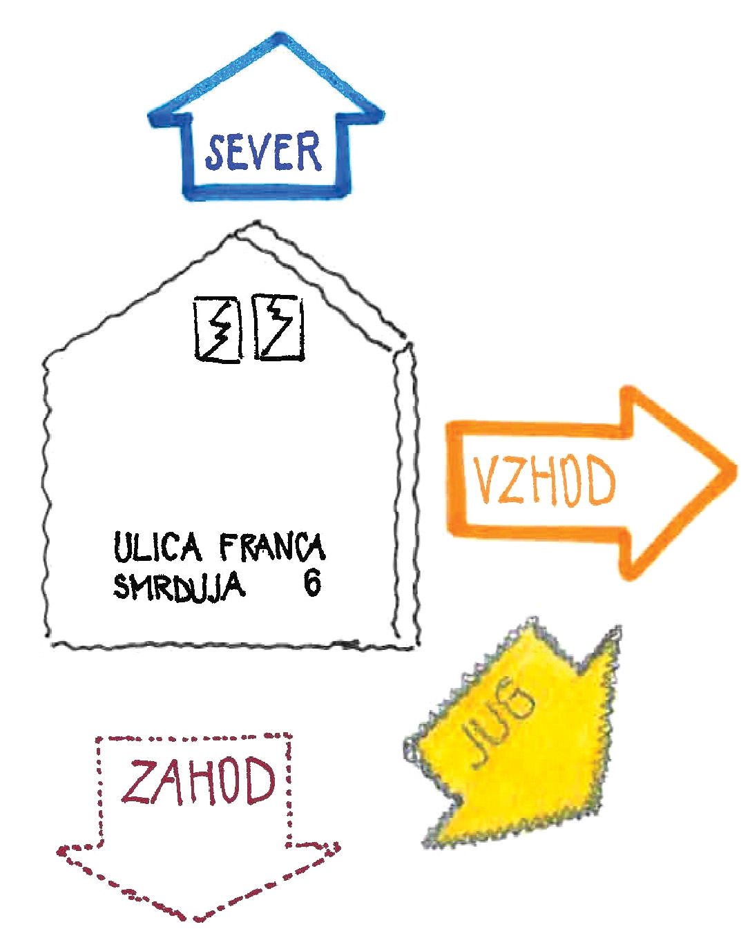 Da ne dolgovezim, na priloženi skici sta vrisani tako počeni okni kot tudi novi smeri zahoda in juga, usmerjeni skladno z dopisom državnega odvetništva. Orientacijo naše hiše smo pred risanjem še enkrat preverili z zračnimi posnetki na dveh javno dostopnih spletnih zemljevidih. O morebitnih spremembah smeri severa in vzhoda iz dopisa državnega odvetništva ne izvemo nič, zato sta na skici narisani po starem. Za morebitne napake na skici ne prevzemam nobene odgovornosti. Če kdo od bralcev potrebuje natančno lego severa ali zahoda v novem sistemu, se mora seveda obrniti na slovensko vojsko.